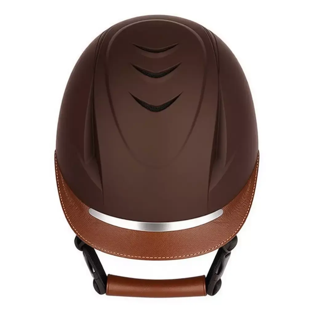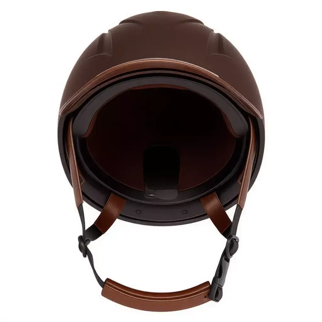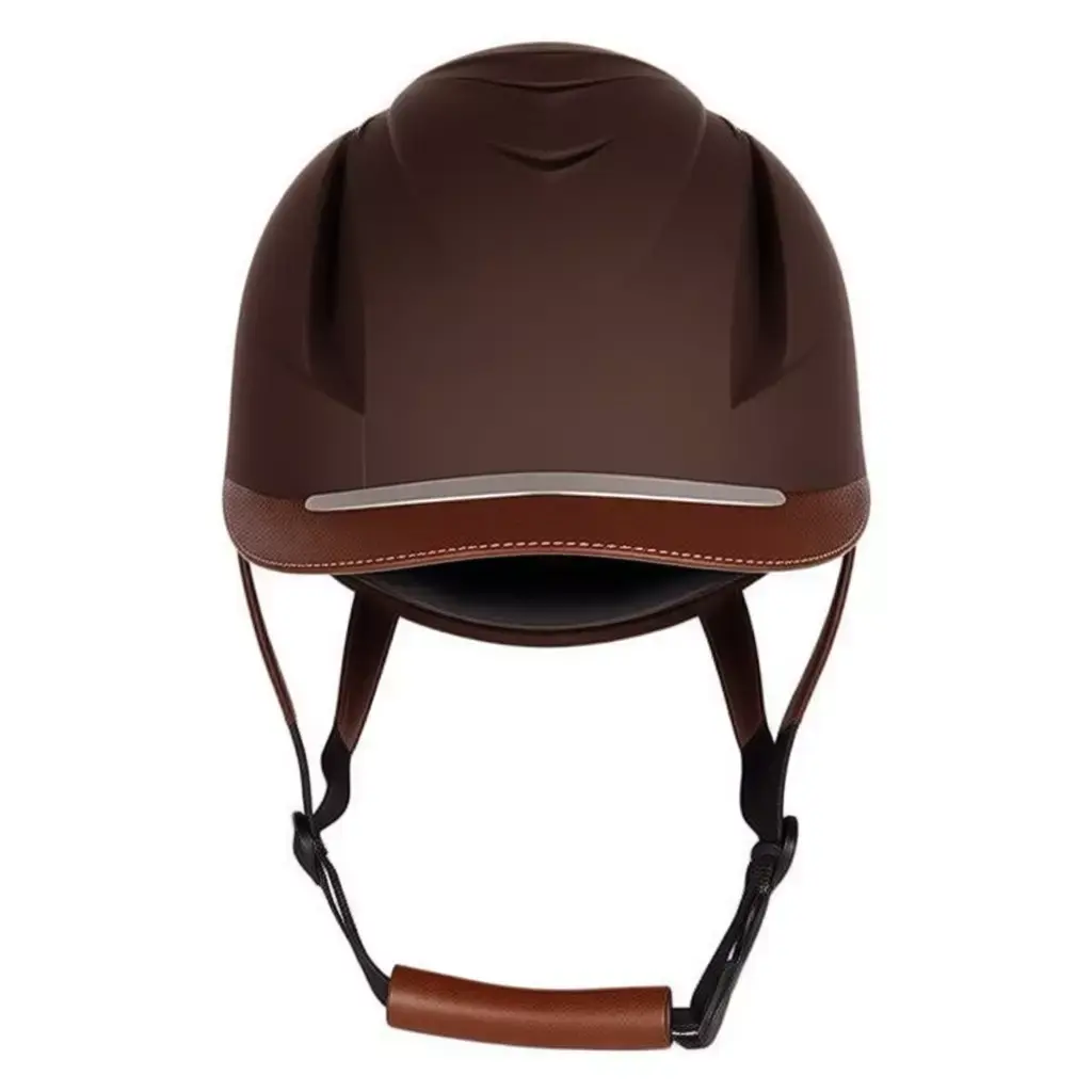 Keywords3D model, equestrian helmet, horse riding gear, safety equipment, leather accents, brown glossy finish, ventilation slots, chin strap, PBR textures, 3D printing, protective headwear, ASTM certification, rider safety, luxury sports accessory.