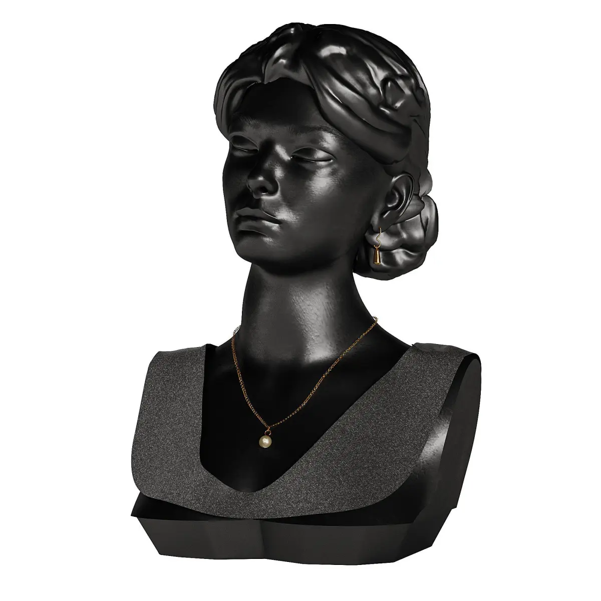 A refined and timeless female bust sculpture featuring graceful contours and a vintage-inspired hairstyle. Perfect for elegant interiors, gallery displays, and boutique showcases. Its minimalist silhouette makes it ideal for decorative arrangements or as a sophisticated focal point in jewelry vitrines and artistic setups. A beautiful blend of classical form with a contemporary touch.
