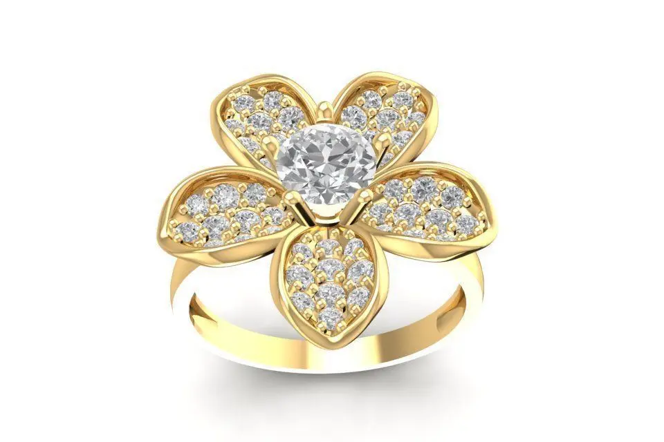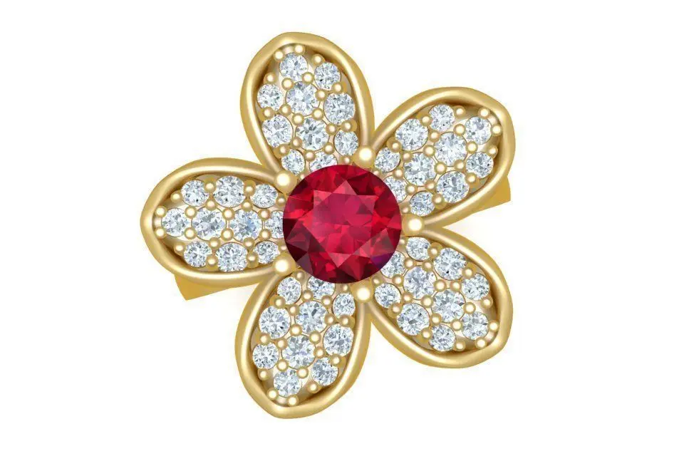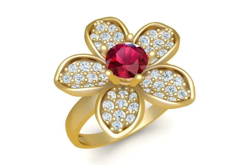 This 3D model features an elegant five petal flower diamond ring for women, symbolizing grace and everlasting beauty. The design highlights a vivid center gemstone, either ruby red or brilliant white, surrounded by five delicately curved petals paved with sparkling round diamonds. The refined floral symmetry enhances light reflection, making it a perfect blend of luxury and femininity.