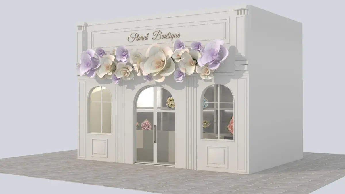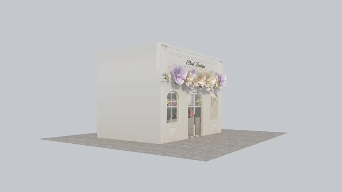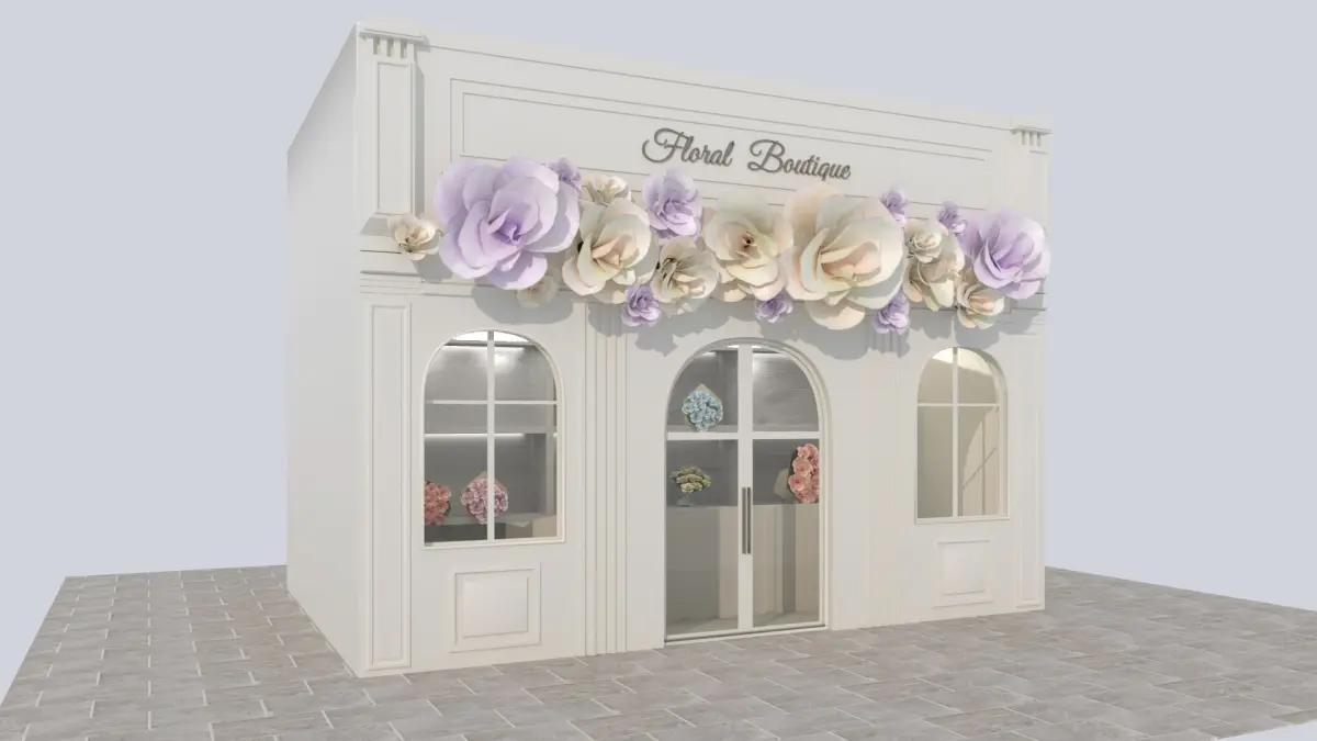 A charming and highly detailed 3D model of a Floral Boutique storefront, perfect for architectural visualization, whimsical scene renders, event backdrops, or creating a unique focal point in your projects. Features intricate white paneling, large arched windows, a double-door entrance, and a beautiful arrangement of stylized pastel flowers adorning the facade.