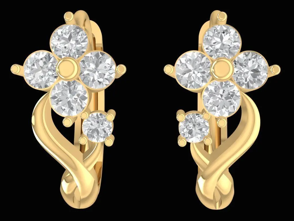 This 3D jewelry model features a pair of elegant floral diamond earrings designed with smooth flowing curves and blooming petals. Each earring highlights a cluster of round-cut diamonds arranged in a delicate flower motif, symbolizing femininity and timeless grace. The soft wave-shaped frame adds sophistication while maintaining perfect balance between modern and classic beauty.