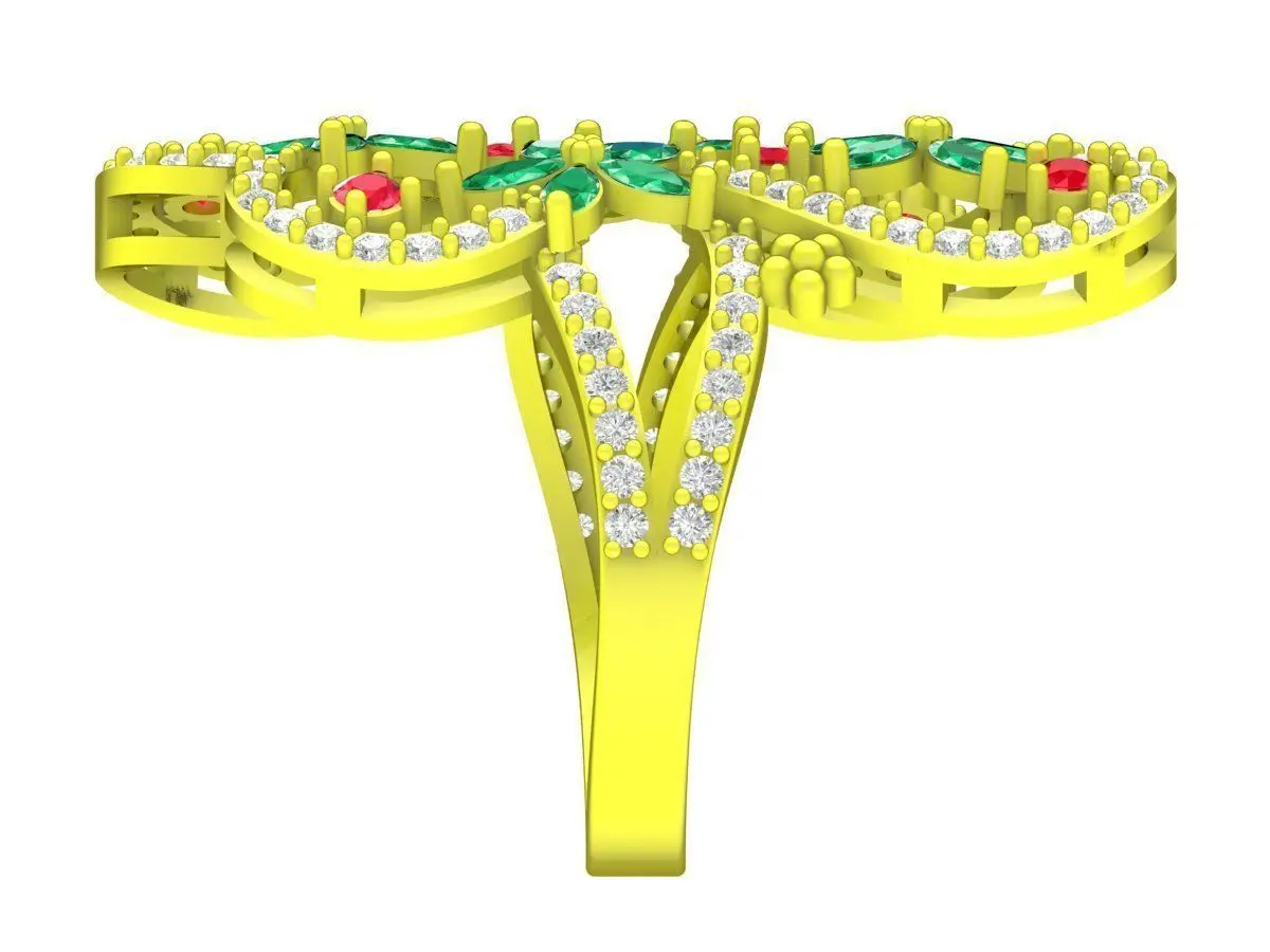 This elegant floral ring 3D model showcases an artistic composition of multiple flower motifs arranged in a flowing and symmetrical layout. Each flower is accented with small gemstone settings, creating a vibrant and luxurious appearance. The design blends floral elegance with refined jewelry craftsmanship, making it ideal for statement rings and high-end collections.
