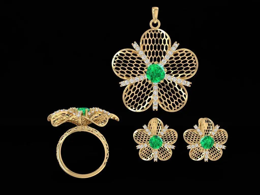 This elegant floral jewelry set for women features a beautifully crafted flower motif designed for rings, pendants, and earrings. The 3D model showcases delicate petal structures, gemstone placements, and intricate metal latticework—ideal for fine jewelry manufacturing and premium customization.