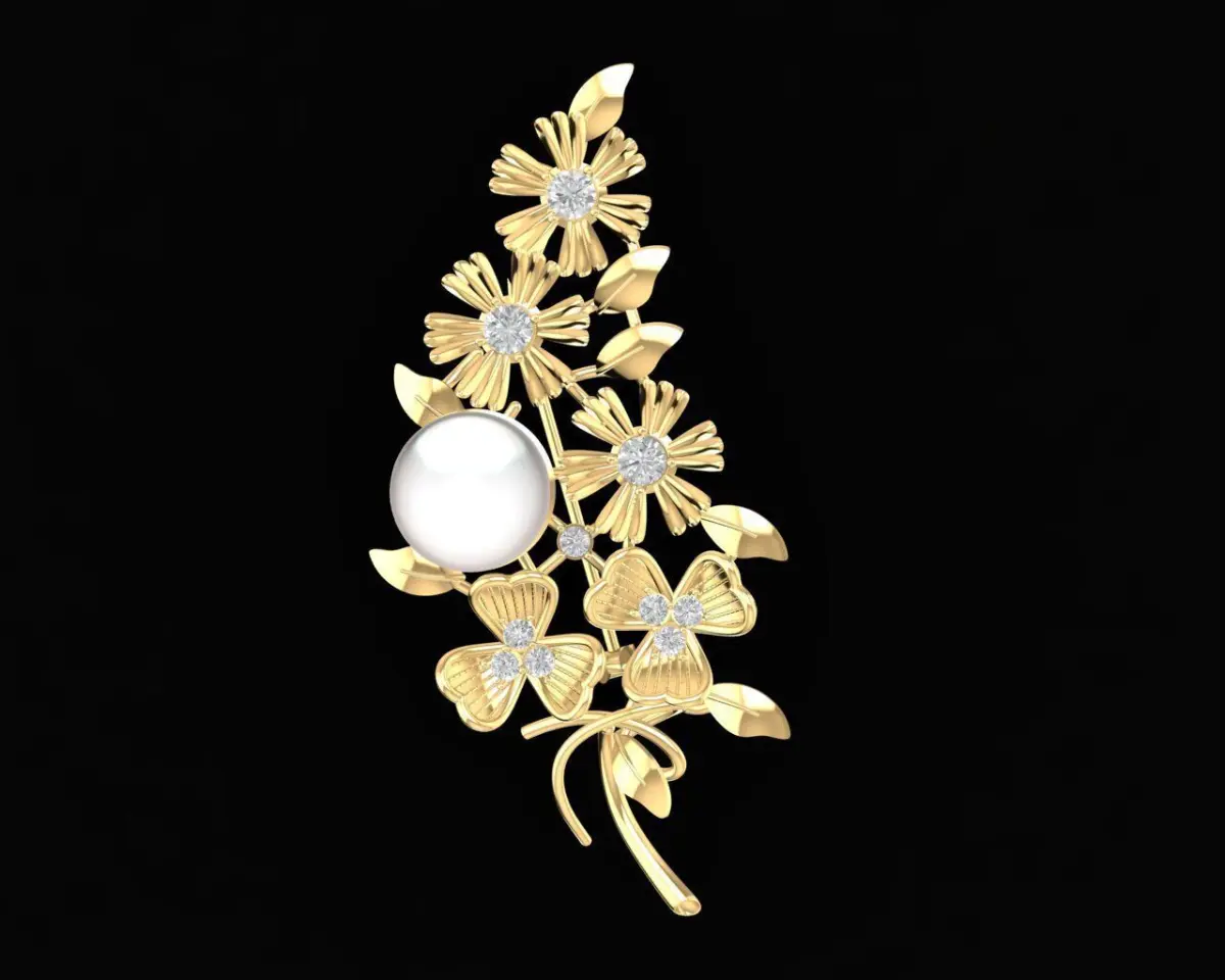 This elegant floral brooch features a graceful arrangement of layered flowers and leaves, highlighted by a central pearl element that creates a refined and feminine focal point. The flowing botanical composition delivers a natural sense of movement while maintaining a balanced and harmonious structure suitable for luxury jewelry collections.