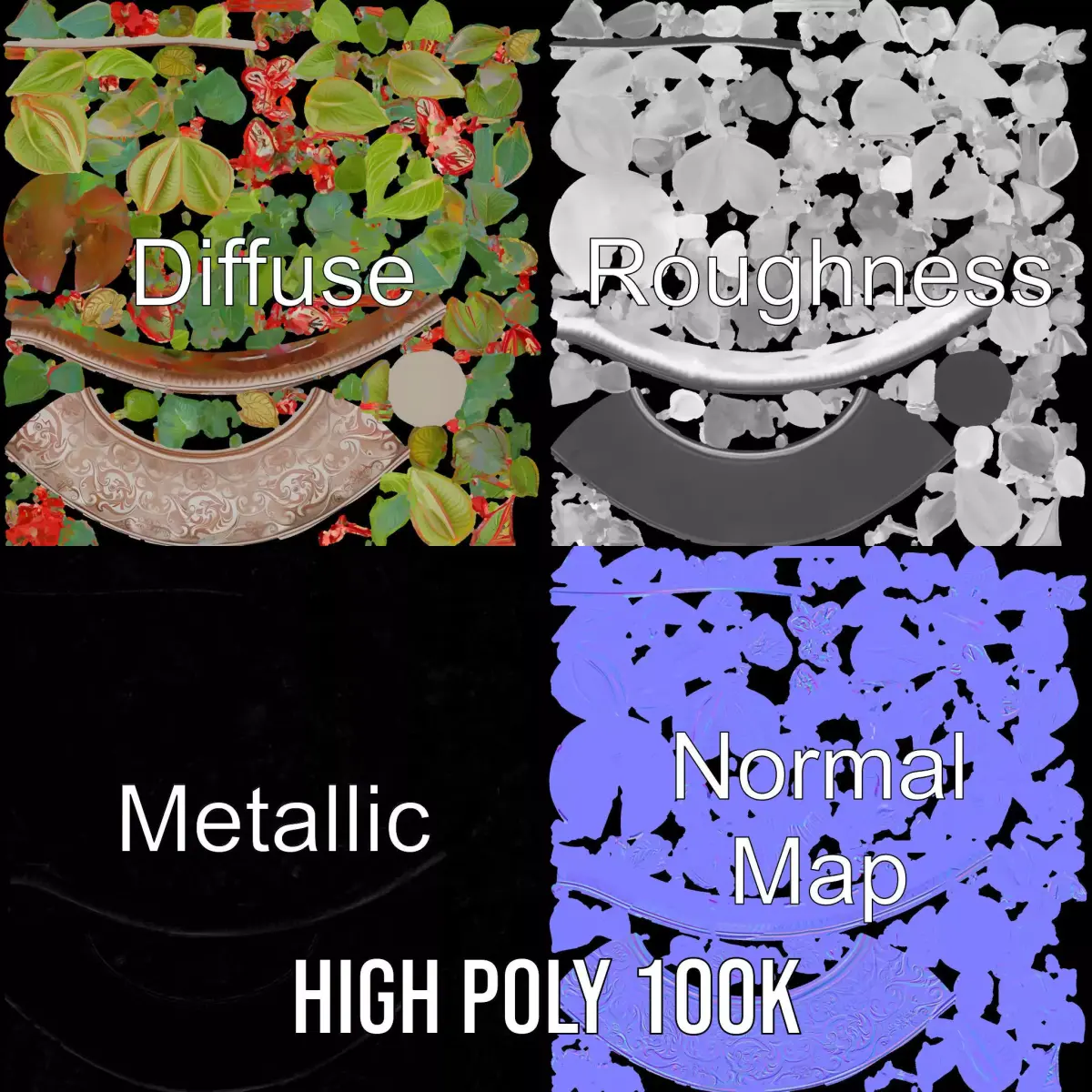 This elegant floral pottery model pack features a beautifully detailed decorative plant arrangement housed in an ornate ceramic pot. Each model has 3 levels of detail: low-poly (1000 triangles for mobile), middle-poly (10,000 triangles for environment), and high-poly (100,000 triangles), which allows for the use of this model in production rendering (such as 3ds Max, Maya, Cinema4D, Blender, Vray/Corona/Cycles, and all others), game engines (Unity and Unreal compatible), and interactive presentations, providing a choice of detail based on the LOD System principle. Ideal for interior design renderings, architectural visualizations, and virtual staging setups. The model's textures are PBR, Diffuse, NormalMap, and reflection/roughness/metallic, which are suitable for any modern rendering engine. All models accurately unwrapped and have no overlapping UVs. Textures are 4096*4096 in size. If you enjoyed this model, please like and leave a comment.