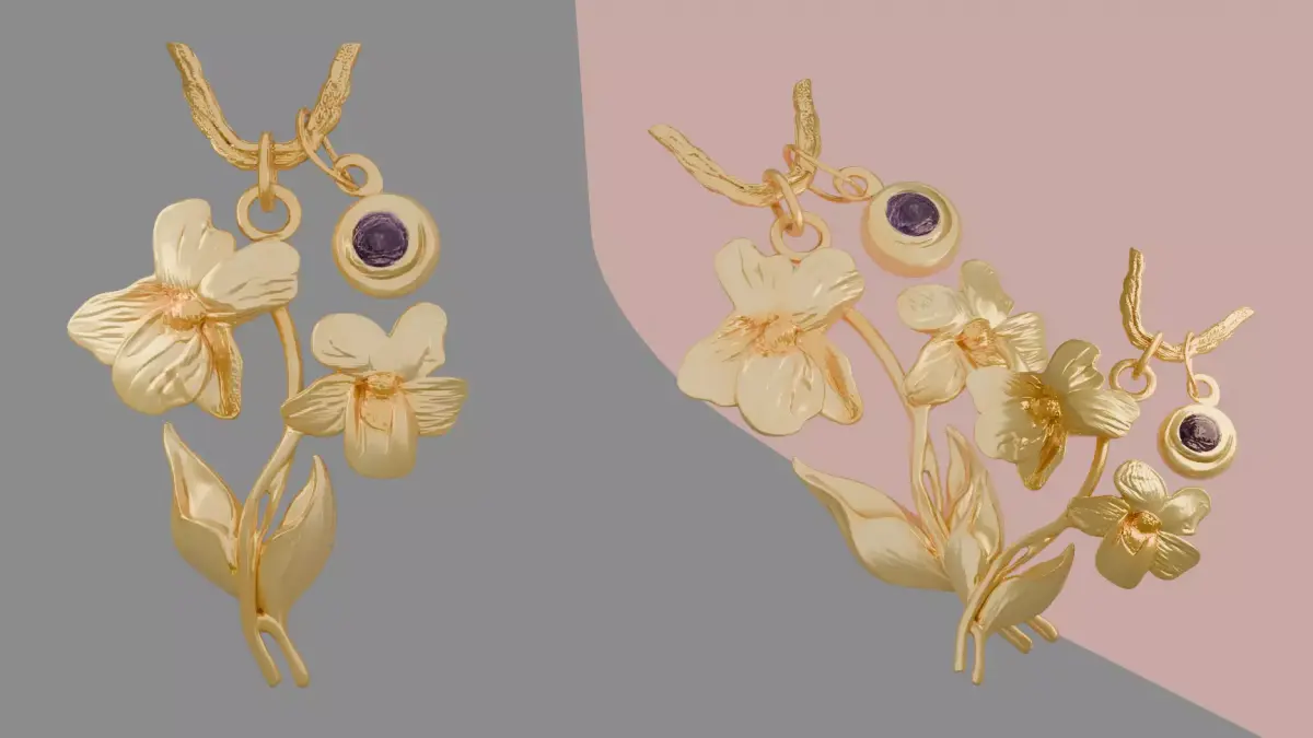This highly detailed 3D model is a beautiful floral pendant or brooch. The design features a delicate bouquet of flowers with intricate petals and leaves, crafted in a realistic gold material. A striking purple gemstone is set above the main floral piece, adding a touch of color and elegance.