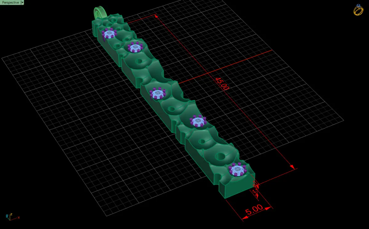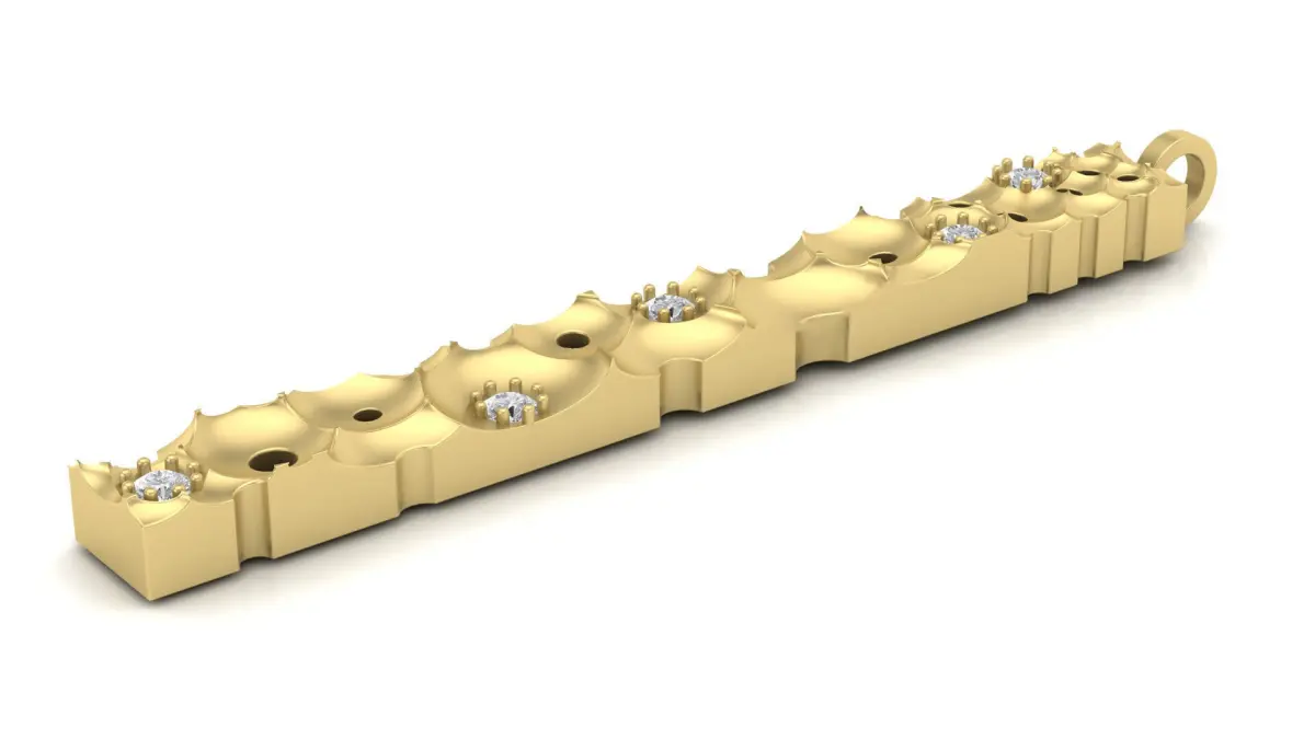 This is a high-quality 3D model of a stylish gold pendant featuring a unique geometric design adorned with 2mm gemstones. The pendant has dimensions of 45x5x3.3mm, making it a sleek and modern jewelry piece. The model is optimized for 3D printing, CNC milling, and jewelry design, with clean geometry and precise detailing. Perfect for jewelers, 3D modelers, and enthusiasts looking for a ready-to-use or customizable pendant design.