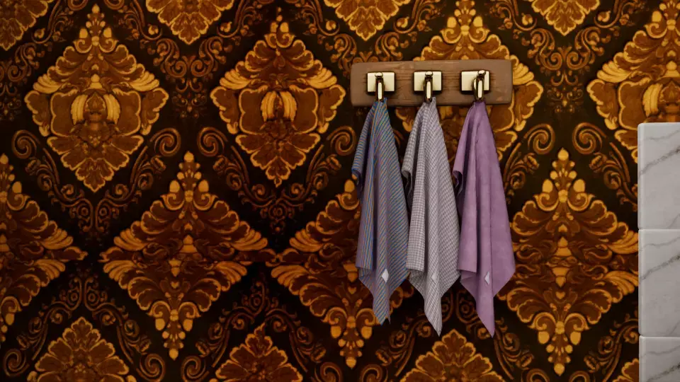The backdrop is an ornate brown and gold damask wallpaper, richly detailed with symmetrical floral and scrolling patterns. This decorative wall treatment brings a sense of classic sophistication and vintage charm to the kitchen, evoking the atmosphere of a traditional European or boutique-style home. The deep, warm tones of the wallpaper create a cozy, inviting environment, while the golden highlights subtly reflect light, adding depth and richness to the scene.