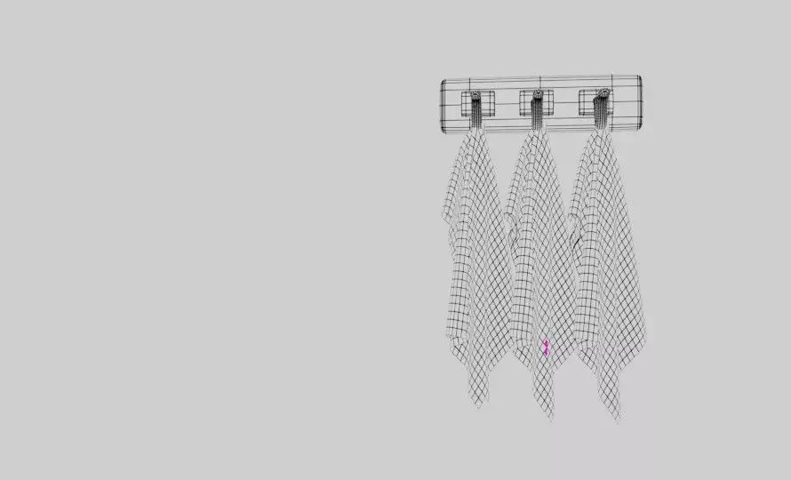 This image depicts a warm and elegant kitchen interior scene featuring three neatly hung kitchen towels displayed on a wooden wall-mounted rack with polished brass hooks. The towels are arranged in a visually balanced way, with each one offering a different color and texture — a blue striped towel, a soft gray textured towel, and a muted purple cloth — adding both visual interest and a sense of everyday functionality. These textiles suggest cleanliness, organization, and readiness for daily kitchen tasks such as drying dishes, wiping surfaces, or handling hot cookware.