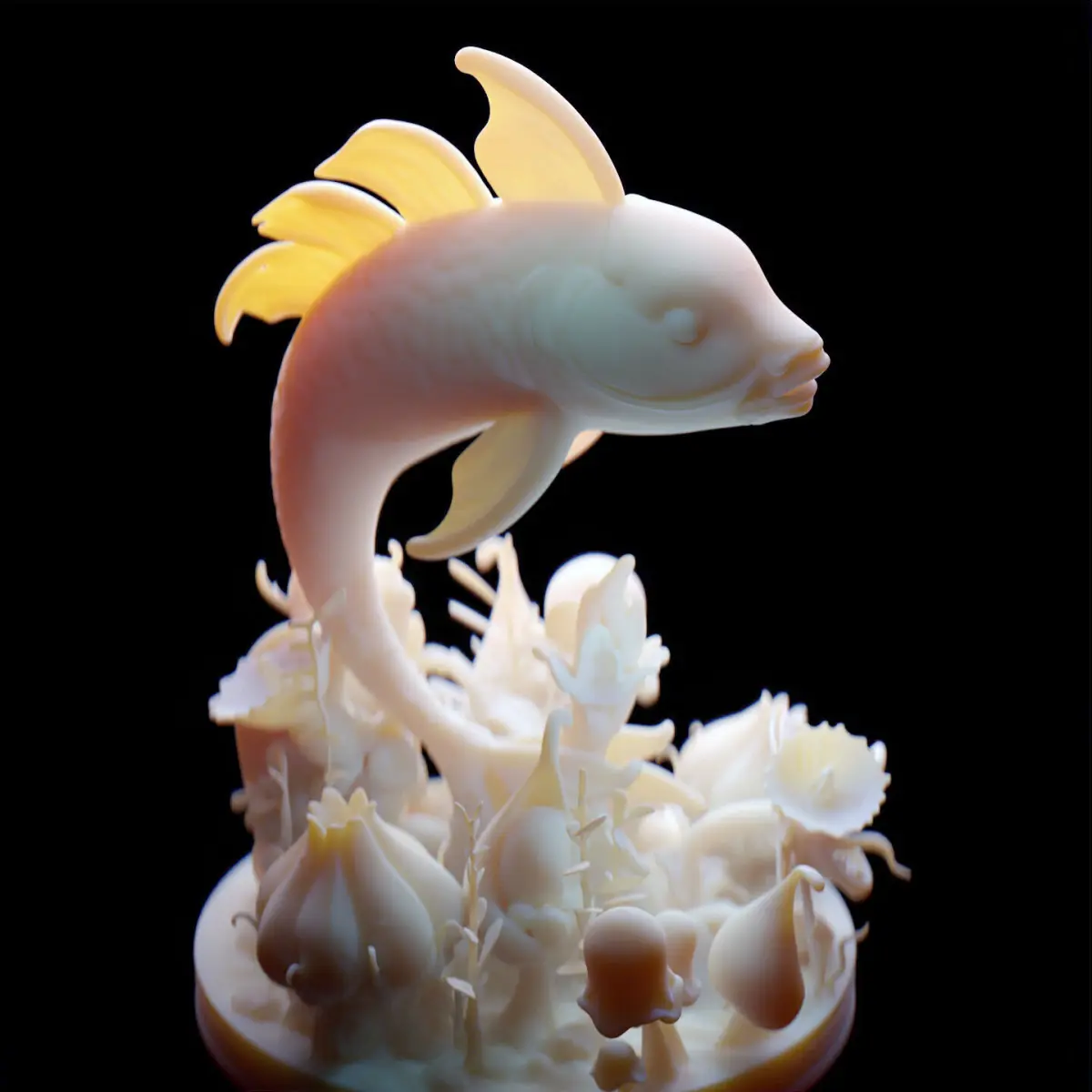 - Botanical Base: Surrounded by a surreal garden of flowing sea plants, fantasy flowers, and abstract organic forms that complement the fish’s motion and enhance visual depth.