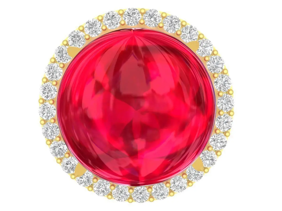This elegant large round halo ring features a stunning oversized center gemstone surrounded by a double-layer halo of brilliant-cut diamonds. The elevated prong setting enhances light performance, giving the central stone exceptional sparkle and depth. The shank is fully paved with diamonds, adding luxury while maintaining a balanced and refined silhouette. The under-gallery is intricately designed, providing both structural strength and an ornate visual appeal.