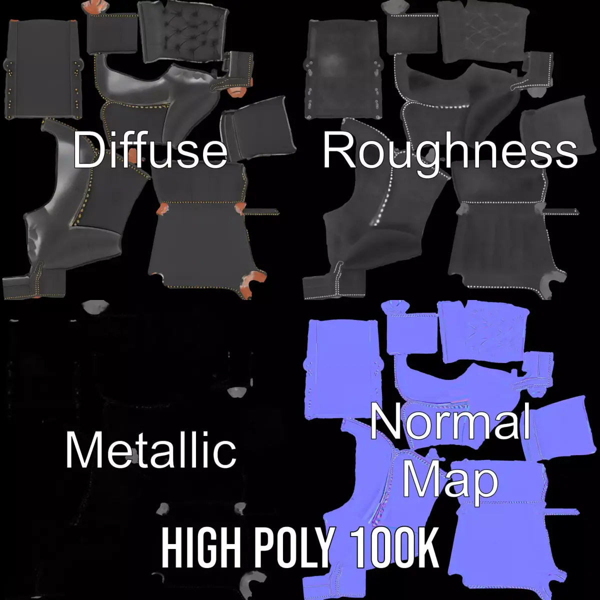 This Elegant Leather Wingback Chair model pack features a sophisticated and classic design with luxurious, tufted leather upholstery and detailed wooden legs. Each model has 3 levels of detail: low-poly (1000 triangles for mobile), middle-poly (10,000 triangles for environment), and high-poly (100,000 triangles), which allows for the use of this model in production rendering (such as 3ds Max, Maya, Cinema4D, Blender, Vray/Corona/Cycles and all others), game engines (Unity and Unreal compatible), and interactive presentations, providing a choice of detail based on the LOD System principle. It's perfect for virtual interior designs, architectural visualizations, or enhancing game environments. The model's textures are PBR, Diffuse, NormalMap, and reflection/roughness/metallic, which are suitable for any modern rendering engine. All models are accurately unwrapped and have no overlapping UVs. All textures are 4096*4096 in size. Like and leave a comment for the model if you enjoy it.