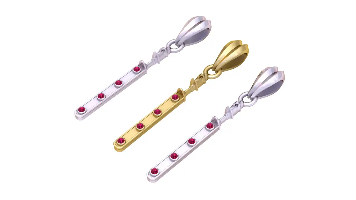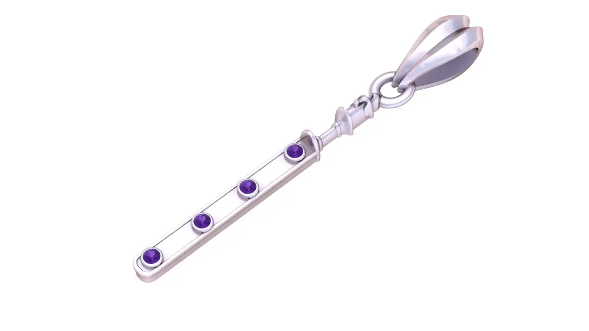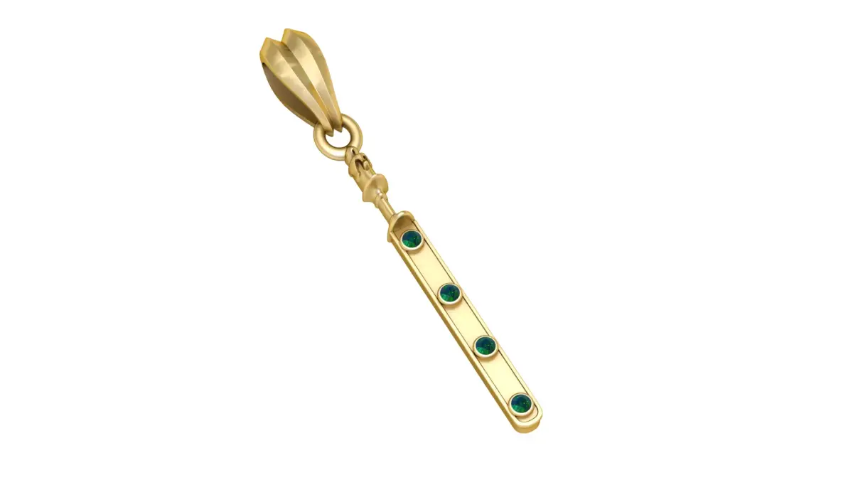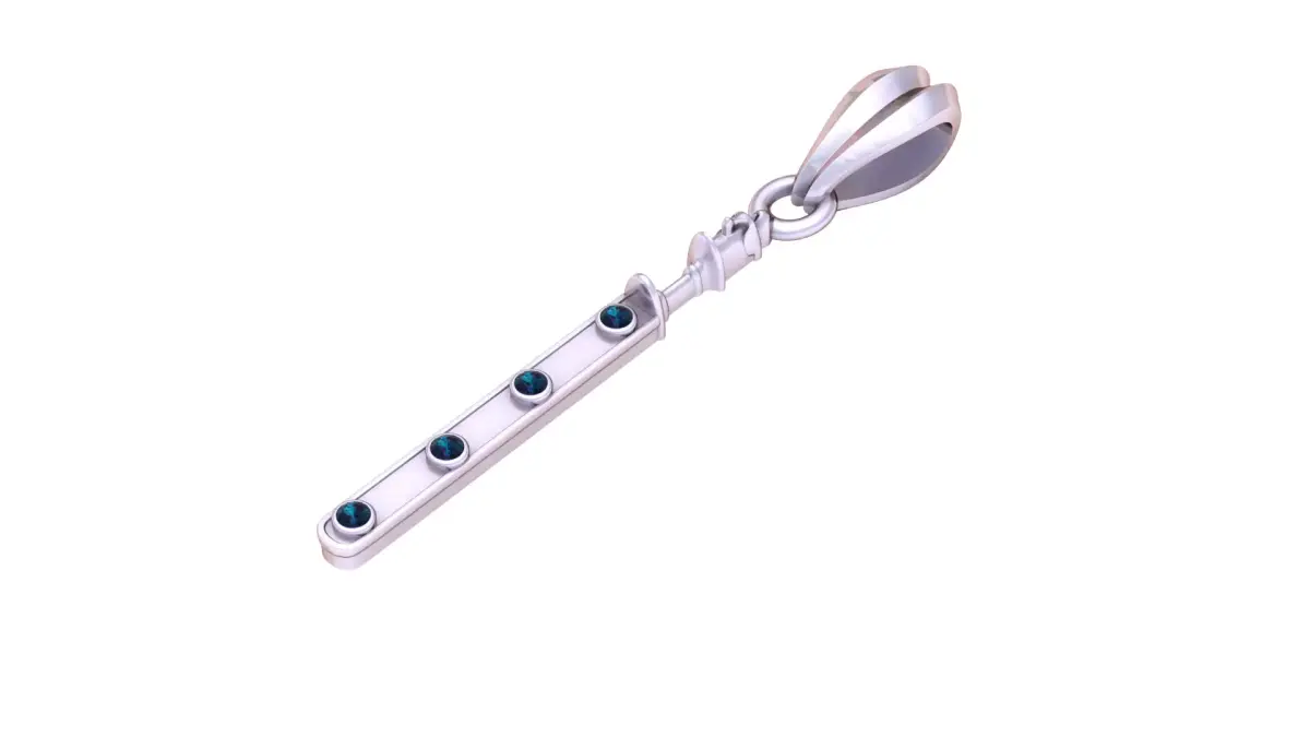This 3D printable pendant features a sleek, elongated bar design adorned with four evenly spaced circular gemstone settings, giving it a refined and modern jewelry aesthetic. The bar hangs from a detailed articulated connector, adding movement and sophistication. The top bail has a sculpted, faceted form that enhances the overall luxurious appeal, making the pendant perfect for metal printing, resin casting, or custom jewelry crafting. Its clean geometry and elegant proportions make it suitable for both everyday wear and premium jewelry collections
