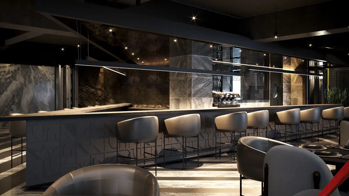 Sleek and Stylish Design Immerse yourself in a world of sophistication with our sleek and stylish restaurant lounge interior design. Featuring clean lines, luxurious furnishings, and refined decor accents, this model radiates an aura of understated elegance and modern luxury.