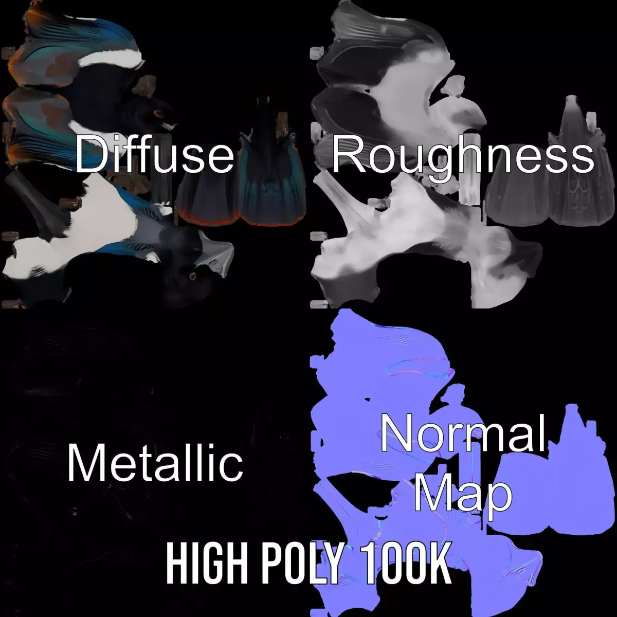 The Elegant Magpie Bird model pack offers a beautifully detailed representation of a magpie, featuring stunning black, white, and iridescent blue feather textures. Each model has 3 levels of detail: low-poly (1000 triangles for mobile), middle-poly (10,000 triangles for environment), and high-poly (100,000 triangles), which allows for use in production rendering (such as 3ds Max, Maya, Cinema 4D, Blender, Vray/Corona/Cycles, and all others), game engines (Unity and Unreal compatible), and interactive presentations, providing a choice of detail based on the LOD System principle. Ideal for nature scenes, wildlife simulation projects, and educational content, this magpie model is versatile and detailed. The model's textures are PBR, Diffuse, NormalMap, and reflection/roughness/metallic, suitable for any modern rendering engine. All models are accurately unwrapped with no overlapping UVs. All textures are 4096x4096 in size. If you like this model, please leave a comment and like.