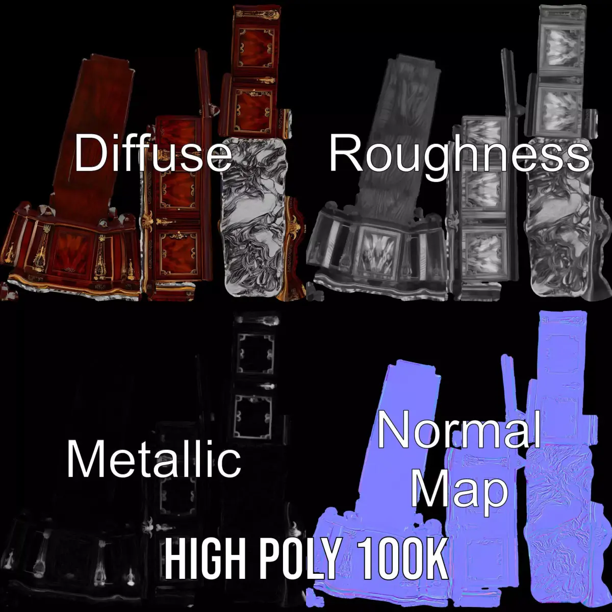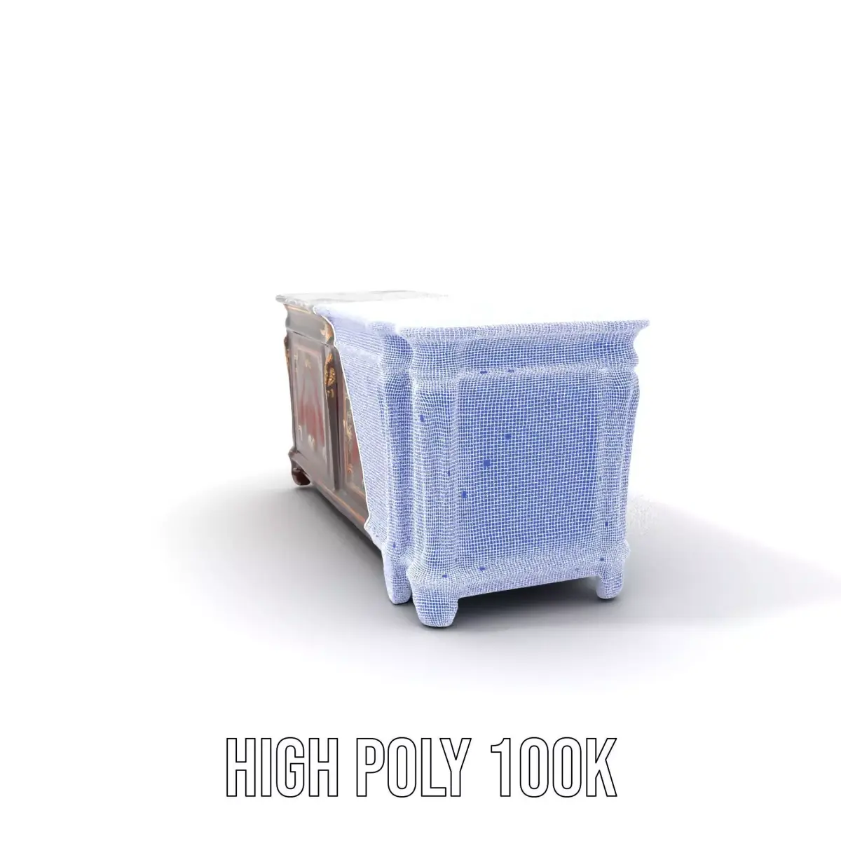 This elegant cabinet with a marble top features exquisite craftsmanship, perfect for historical or luxurious interior scenes. With intricate detailing and a rich wood texture, it adds sophistication to any environment. Each model has 3 levels of detail: low-poly (1000 triangles for mobile), middle-poly (10,000 triangles for environment), and high-poly (100,000 triangles), which allows for the use of this model in production rendering (such as 3ds Max, Maya, Cinema 4D, Blender, Vray/Corona/Cycles, and all others), game engines (Unity and Unreal compatible), and interactive presentations, providing a choice of detail based on the LOD System principle. Potential uses include historical recreations or luxurious home renders. The model's textures are PBR, Diffuse, NormalMap, and reflection/roughness/metallic, suitable for any modern rendering engine. All models are accurately unwrapped and have no overlapping UV. All textures are 4096*4096 in size. Please like and leave a comment if you enjoyed the model.