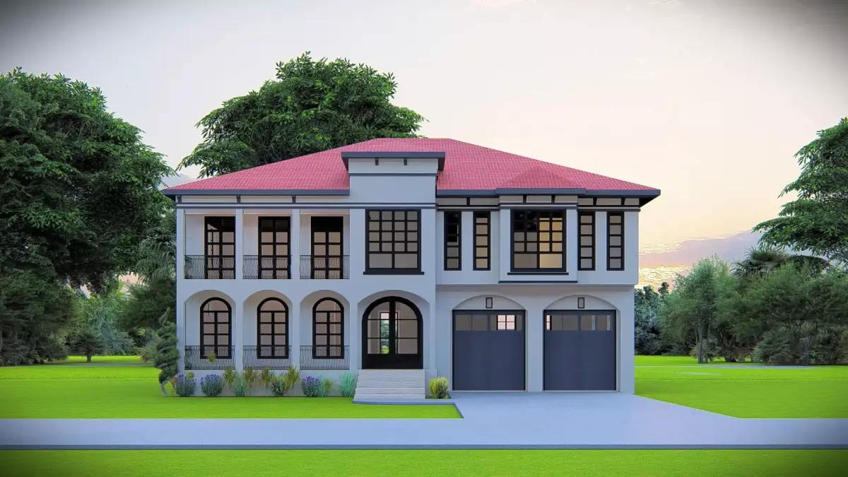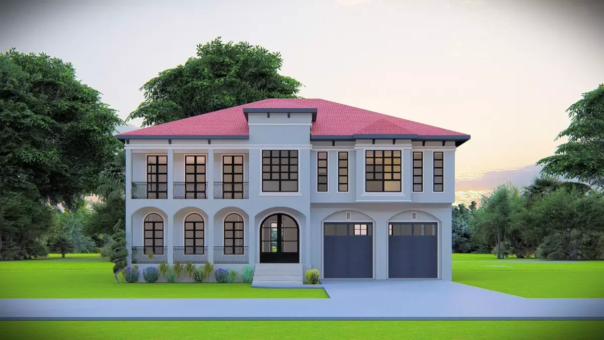 The villa’s design includes symmetrical facades, double garage, and landscaped surroundings, making it an ideal choice for luxury residential projects, real estate visualization, and architectural presentations. The arched openings and wrought iron details highlight its authentic European influence, while the clean design ensures it blends seamlessly into modern environments.