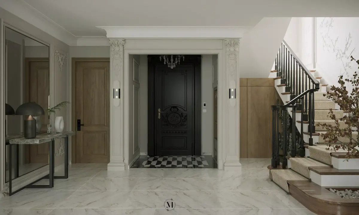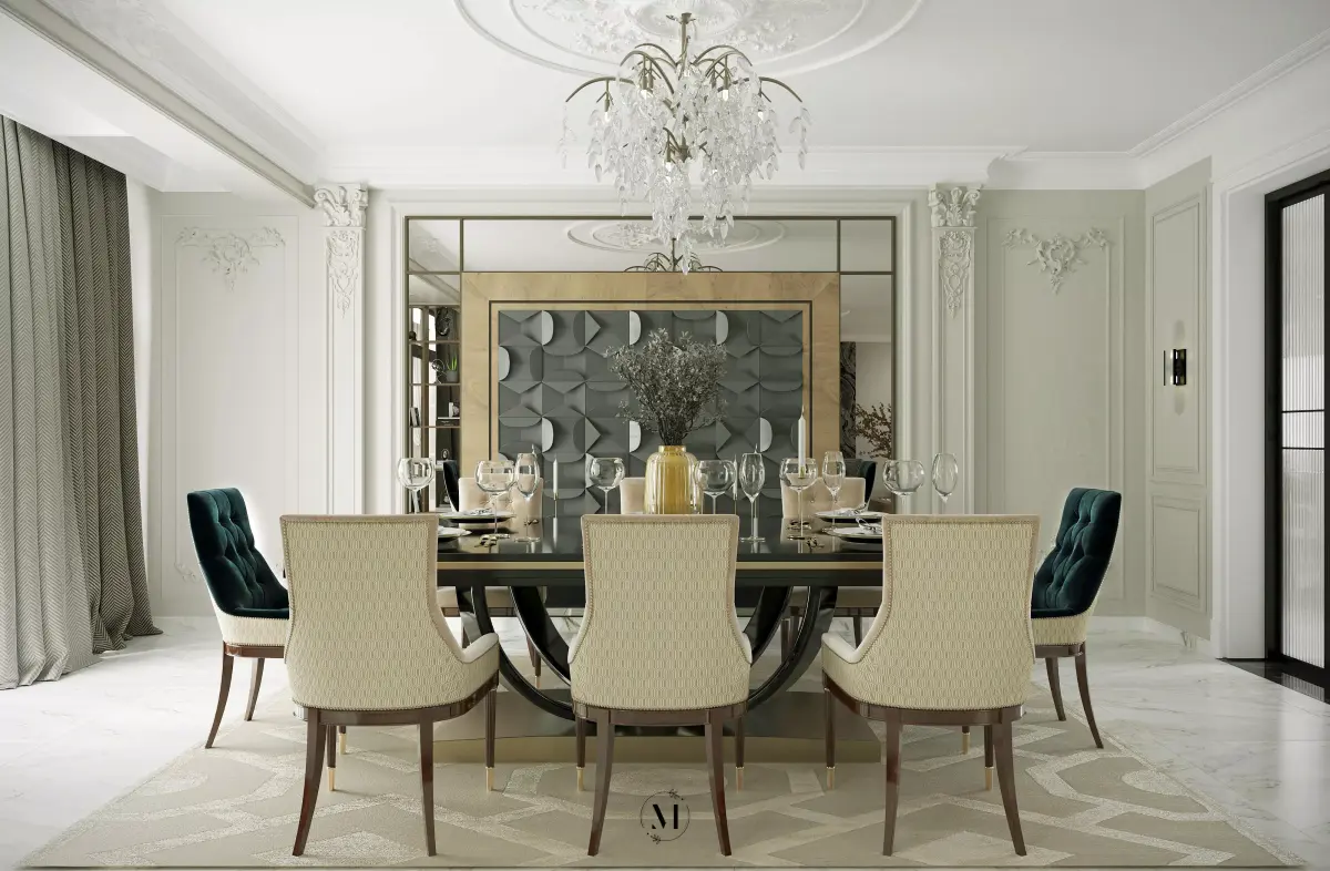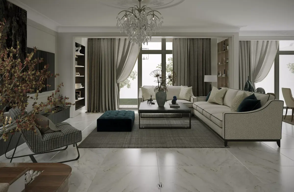 Elegant Modern Classic Open-Plan Living & Dining SceneImmerse your renders in a world of refined elegance with this high-quality 3D model of a sophisticated, open-plan living and dining room. This meticulously crafted scene seamlessly blends classic luxury with contemporary design, making it a perfect asset for high-end residential visualizations, virtual staging, and architectural presentations.Scene DetailsSophisticated Furniture: The living area is centered around a plush, dark velvet sofa, complemented by a round glass coffee table and two stylish, tufted armchairs. The dining area features a striking round glass table paired with six exquisitely upholstered dining chairs.Luxurious Materials: The space is defined by its use of premium materials. The floor is a stunning, light-colored marble or polished stone with a detailed geometric inlay pattern. The TV wall is a focal point, featuring a mix of materials including veined marble and a dark border.Elegant Lighting: A grand, multi-tiered crystal chandelier hangs over the dining table, serving as a breathtaking centerpiece. The scene is further illuminated by a modern floor lamp, a table lamp, and integrated recessed ceiling spotlights.Refined Architectural Details: The walls are adorned with sophisticated classic moldings and paneling, adding depth and character. Large windows are dressed with a combination of luxurious drapes and sheer curtains, providing both style and natural light.Cohesive Decor: The scene is completed with carefully placed decor, including a large, elegant rug that anchors the living area, a console table, throw pillows, and decorative vases, all contributing to a complete and inviting atmosphere.This fully textured and ready-to-render model is ideal for architects, interior designers, and 3D artists looking for a turnkey solution to showcase a luxurious and stylish residential interior.