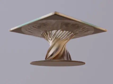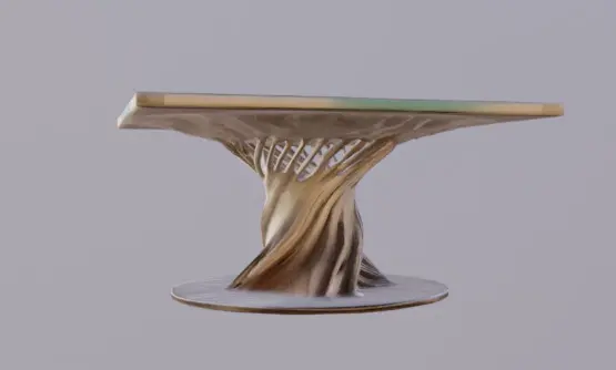 This is a high-quality 3D model of an elegant square table inspired by natural forms. The base structure mimics the organic flow of tree roots, creating a stunning visual effect. The tabletop features a polished surface with a mesmerizing wood-grain pattern, complemented by a glass-like finish.