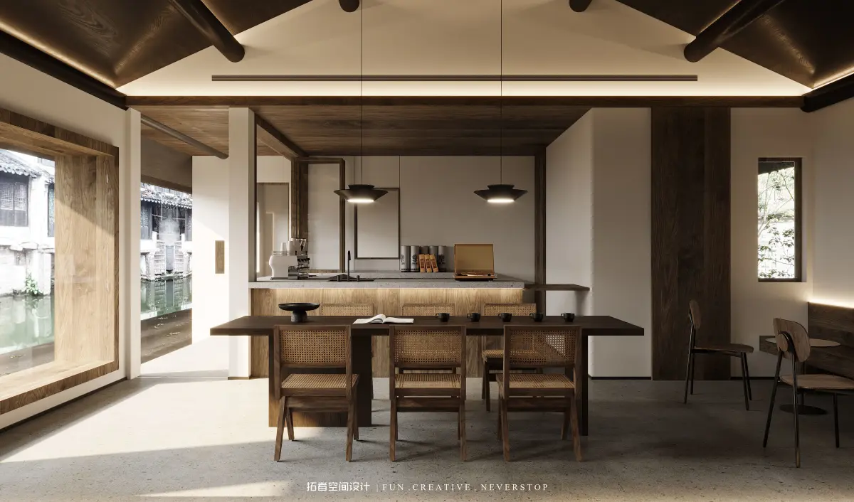 Detailed 3D models of custom wooden tables and chairs, showcasing intricate designs that echo the rich cultural heritage.A well-equipped coffee bar that combines functionality with aesthetic grace.Ambient lighting that casts soft shadows, enhancing the inviting atmosphere.Traditional architectural elements in the background, offering a glimpse into China’s illustrious history while complementing the modern amenities.This complete set is perfect for those looking to infuse their spaces with a touch of class, offering clients an experience that transcends the ordinary coffee shop visit. Every element is rendered in high quality, ensuring your presentations capture the exquisite detail and craftsmanship inherent in this unique style.