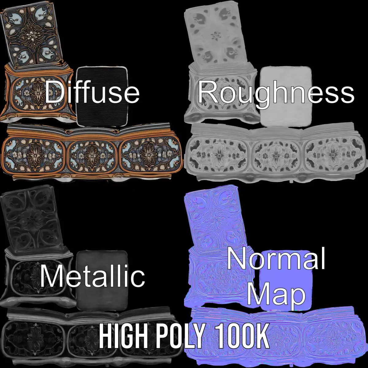 The Elegant Ornate Box model pack features a beautifully designed decorative box ideal for scenes requiring an element of luxury and detail. Each model has 3 levels of detail: low-poly (1000 triangles for mobile), middle-poly (10,000 triangles for environment), and high-poly (100,000 triangles), allowing for use in production rendering, game engines, and interactive presentations. The model's PBR textures include Diffuse, NormalMap, and reflection/roughness/metallic, suitable for any modern rendering engine. All models are accurately unwrapped with no overlapping UVs. Perfect for antique shops, vintage settings, and high-detail close-up renders. Textures are 4096*4096 in size. If you enjoyed this model, please like and leave a comment!