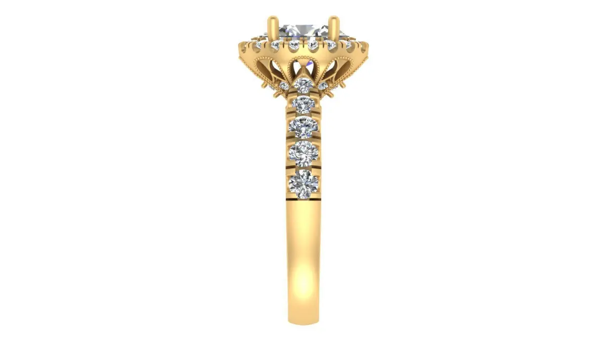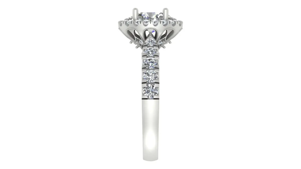 The shank is adorned with pavé-set diamonds, providing a continuous sparkle along the band. The ring's under-gallery features intricate filigree and heart-shaped cutouts, adding a romantic and vintage touch. Designed for both luxury and comfort, this piece is a perfect choice for engagements, weddings, or as a timeless keepsake.