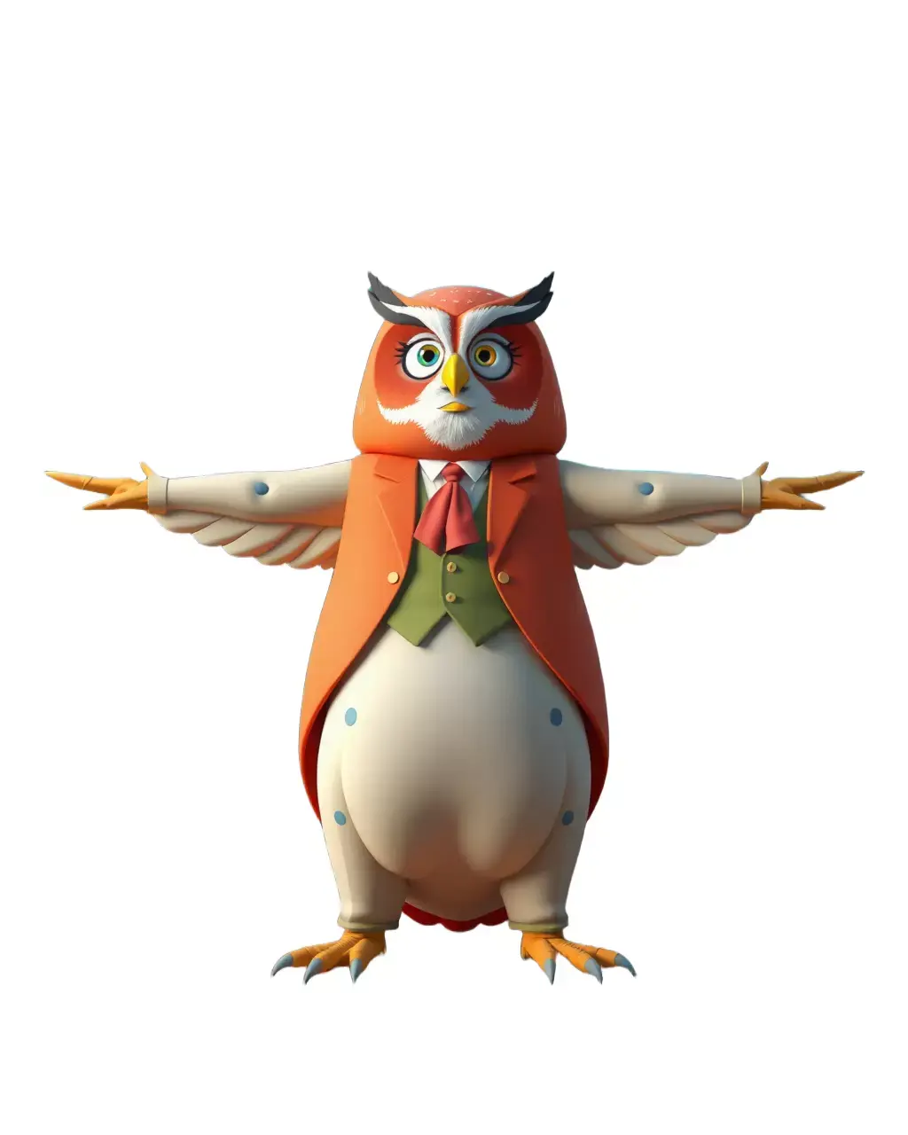 This elegant owl character brings charm and whimsy to any scene with its vibrant suit and playful design. Each model has 3 levels of detail: low-poly (1000 triangles for mobile), middle-poly (10,000 triangles for environment), and high-poly (100,000 triangles), which allows for the use of this model in production rendering (such as 3ds max, Maya, Cinema4d, Blender, Vray/Corona/Cycles and all other), game engines (Unity and Unreal compatible), and interactive presentations, providing a choice of detail based on the LOD System principle. The model is perfect for animated films, educational content, and virtual storytelling. Its high-quality textures make it suitable for both game and cinematic applications. The model's textures are PBR, Diffuse, NormalMap, and reflection/roughness/metallic, which are suitable for any modern rendering engine. All models are accurately unwrapped and have no overlapping UV. All textures are 4096*4096 in size. If you enjoy this model, please like and leave a comment!