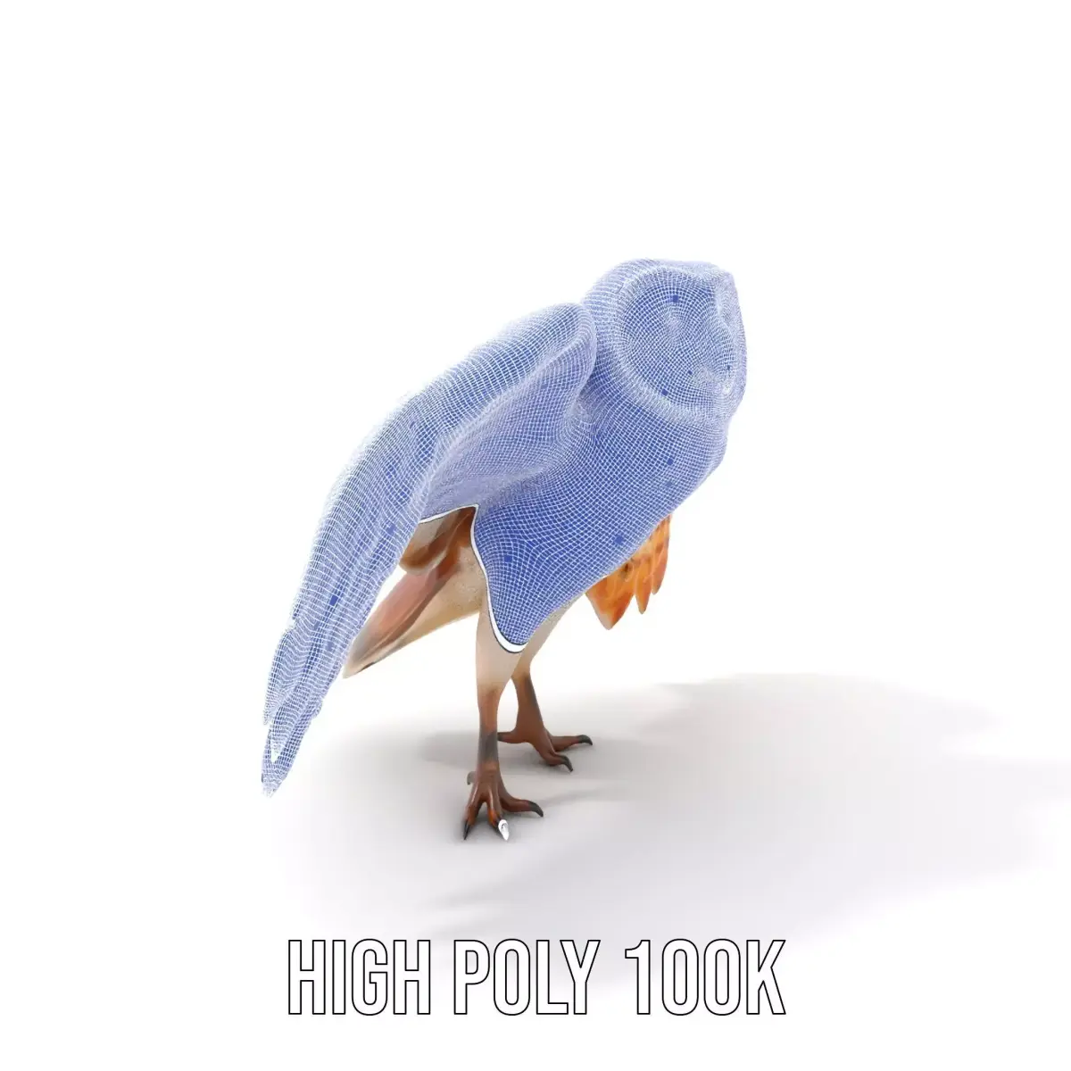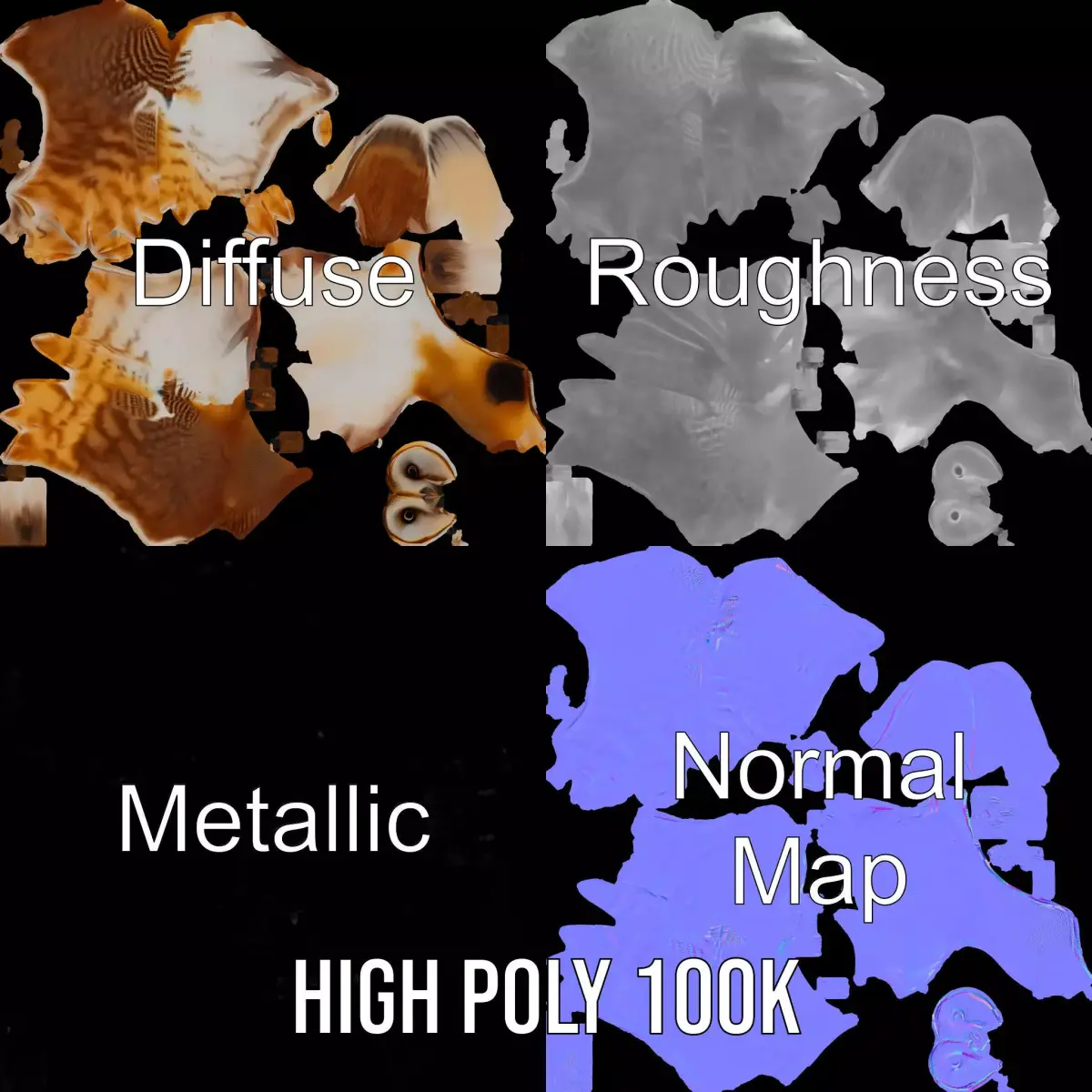 This elegant owl 3D model captures the graceful and majestic appearance of a barn owl, with detailed feathers and expressive eyes. Each model has 3 levels of detail: low-poly (1000 triangles for mobile), middle-poly (10,000 triangles for environment), and high-poly (100,000 triangles), which allows for the use of this model in production rendering (such as 3ds Max, Maya, Cinema4D, Blender, Vray/Corona/Cycles, and all others), game engines (Unity and Unreal compatible), and interactive presentations, providing a choice of detail based on the LOD System principle. Perfect for wildlife simulations, animations, and educational projects. The model's textures are PBR, Diffuse, NormalMap, and reflection/roughness/metallic, which are suitable for any modern rendering engine. All models are accurately unwrapped with no overlapping UVs. All textures are 4096x4096 in size. Please like and leave a comment if you enjoyed this model.