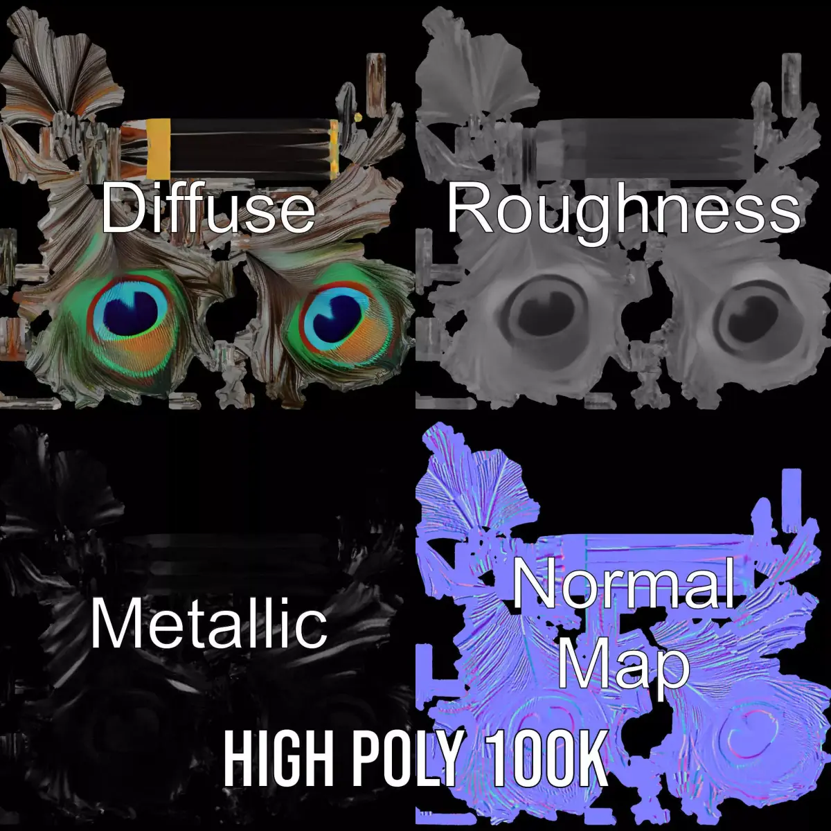 The Elegant Peacock Quill Pen model pack is a stunning collection that replicates the intricate design of a peacock feather combined with a sleek pen handle. Each model has 3 levels of detail: low-poly (1000 triangles for mobile), middle-poly (10,000 triangles for environment), and high-poly (100,000 triangles), which allows for the use of this model in production rendering (such as 3ds Max, Maya, Cinema4D, Blender, Vray/Corona/Cycles and all others), game engines (Unity and Unreal compatible), and interactive presentations, providing a choice of detail based on the LOD System principle. Perfect for historical recreations, luxury office scenes, or as a decorative element in period dramas. The model's textures are PBR, Diffuse, NormalMap, and reflection/roughness/metallic, which are suitable for any modern rendering engine. All models accurately unwrapped and have no overlapping UVs. All textures are 4096*4096 in size. If you enjoyed this model, please like and leave a comment!