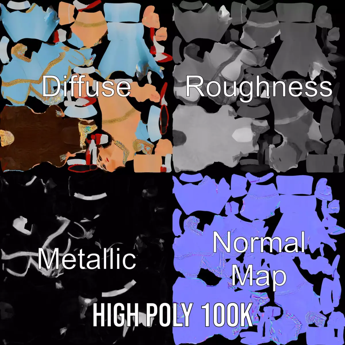 This elegant performer model pack features a detailed fantasy character designed with intricate accessories and a colorful costume. Each model has 3 levels of detail: low-poly (1000 triangles for mobile), middle-poly (10,000 triangles for environment), and high-poly (100,000 triangles), which allows for the use of this model in production rendering (such as 3ds Max, Maya, Cinema 4D, Blender, Vray/Corona/Cycles and others), game engines (Unity and Unreal compatible), and interactive presentations, providing a choice of detail based on the LOD System principle. This model is perfect for use in fantasy games, animated films, and virtual reality experiences. The model's textures are PBR, Diffuse, NormalMap, and reflection/roughness/metallic, which are suitable for any modern rendering engine. All models accurately unwrapped and have no overlapping UV. All textures are 4096*4096 in size. The first image is the reference used for creating the 3D model. It is important to carefully evaluate the quality of the model by examining the preview images that display the topology and polygonal mesh. These previews (WIRE and WEB 3D Preview) clearly demonstrate how accurately the model matches the original reference and how well the geometry has been executed. Please like and leave a comment for the model if you enjoyed it.
