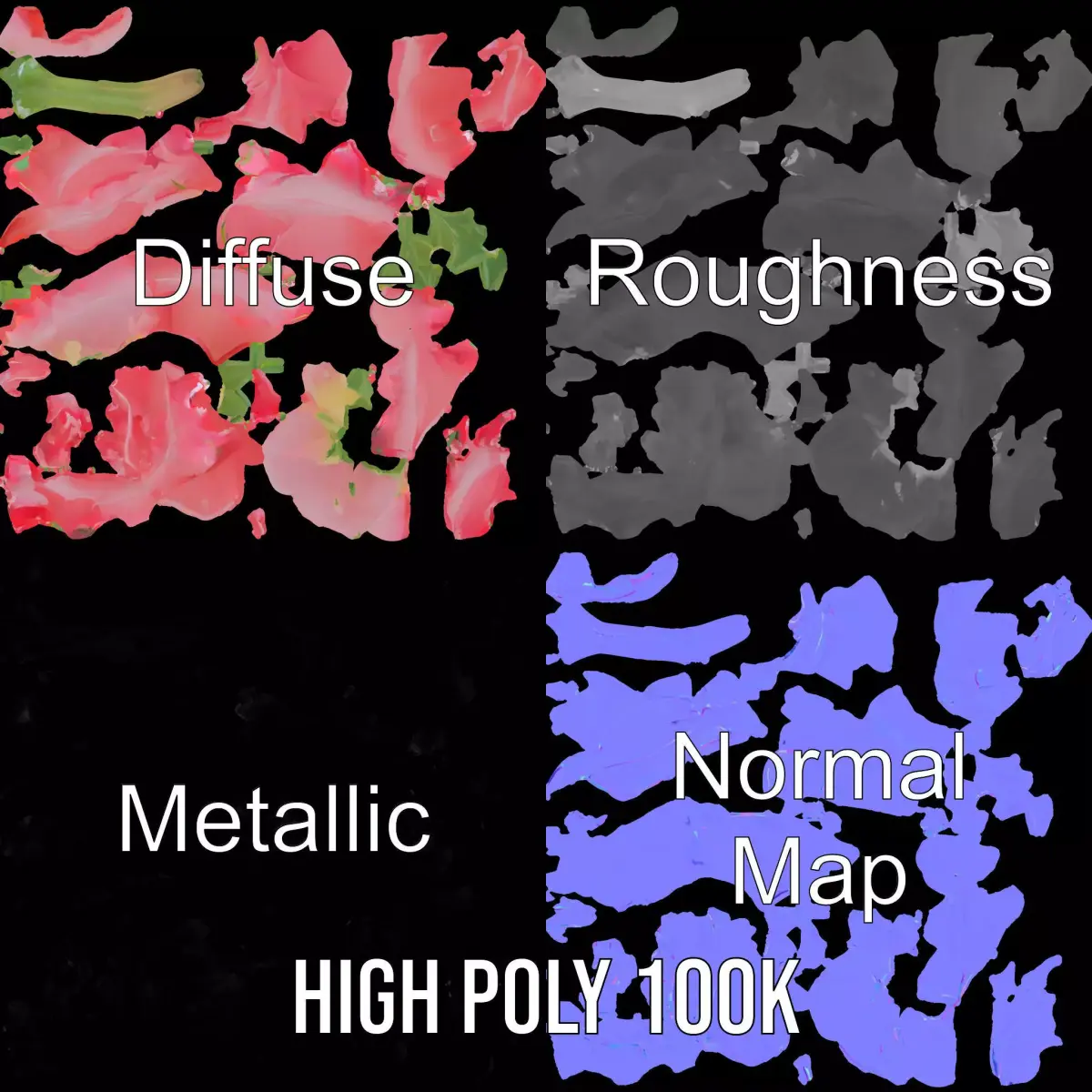 This elegant pink rose 3D model is perfect for enhancing floral visualizations, romantic scenes, or nature-inspired projects. Each model has 3 levels of detail: low-poly (1000 triangles for mobile), middle-poly (10,000 triangles for environment), and high-poly (100,000 triangles), which allows for the use of this model in production rendering (such as 3ds Max, Maya, Cinema4D, Blender, Vray/Corona/Cycles and all others), game engines (Unity and Unreal compatible), and interactive presentations, providing a choice of detail based on the LOD System principle. The model's textures are PBR, Diffuse, NormalMap, and reflection/roughness/metallic, which are suitable for any modern rendering engine. All models are accurately unwrapped and have no overlapping UVs. All textures are 4096x4096 in size. The first image is the reference used for creating the 3D model. It is important to carefully evaluate the quality of the model by examining the preview images that display the topology and polygonal mesh. These previews (WIRE and WEB 3D Preview) clearly demonstrate how accurately the model matches the original reference and how well the geometry has been executed. Please like and leave a comment if you enjoyed this model!