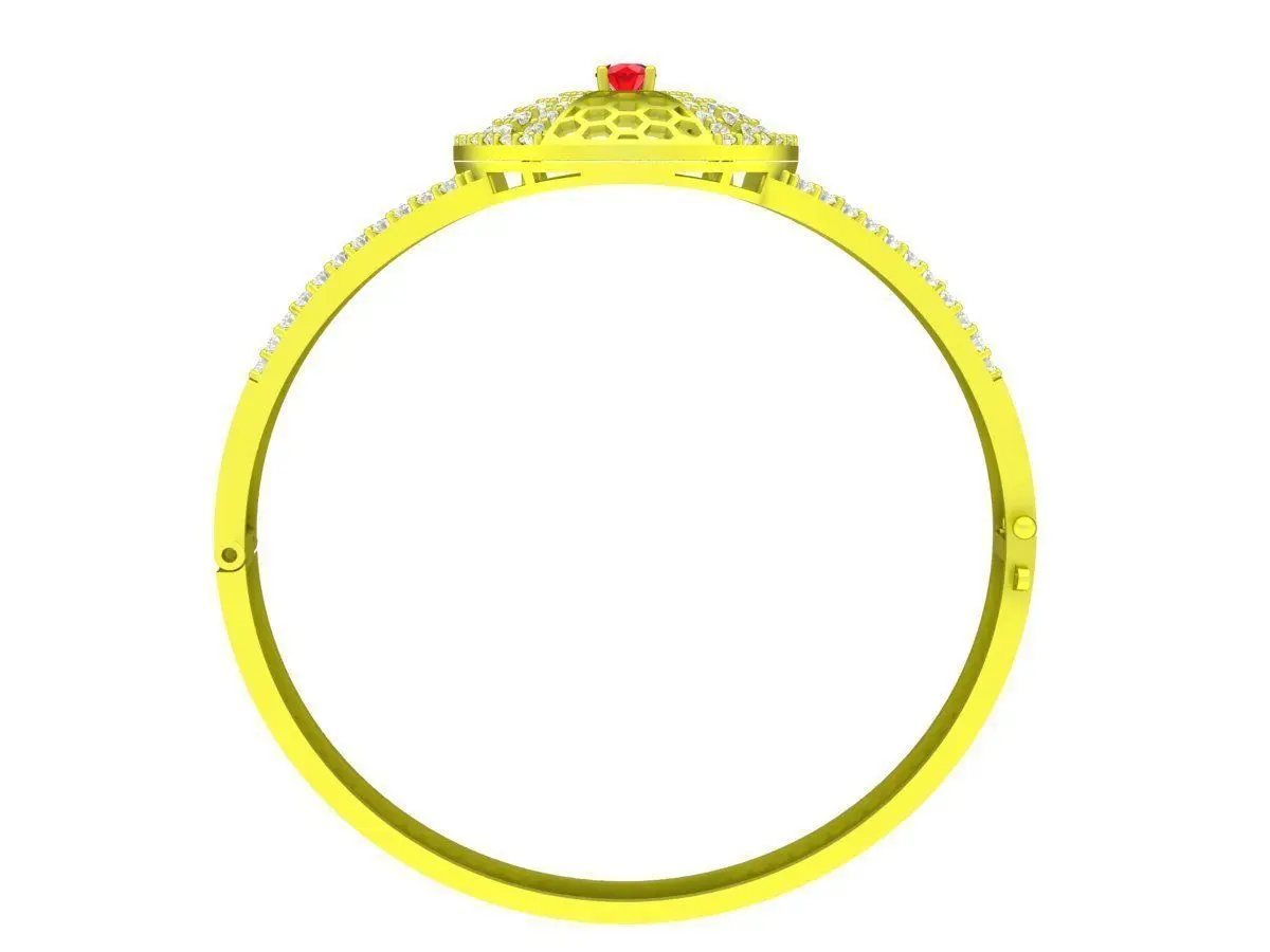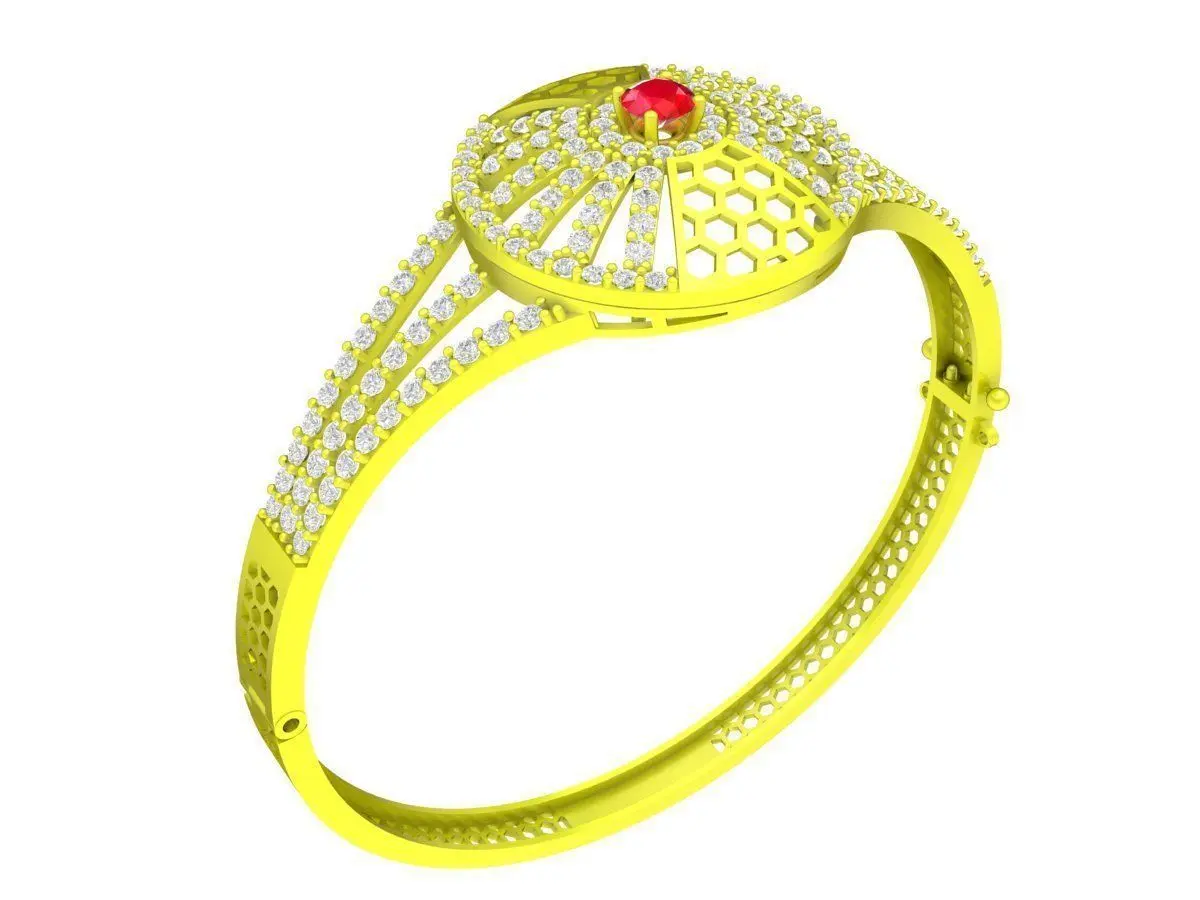 This 3D jewelry model presents an elegant women’s ring featuring a round halo design with a vivid center stone surrounded by pavé-set diamonds. The open lattice structure enhances light reflection while keeping the ring lightweight and refined, ideal for luxury and contemporary collections.