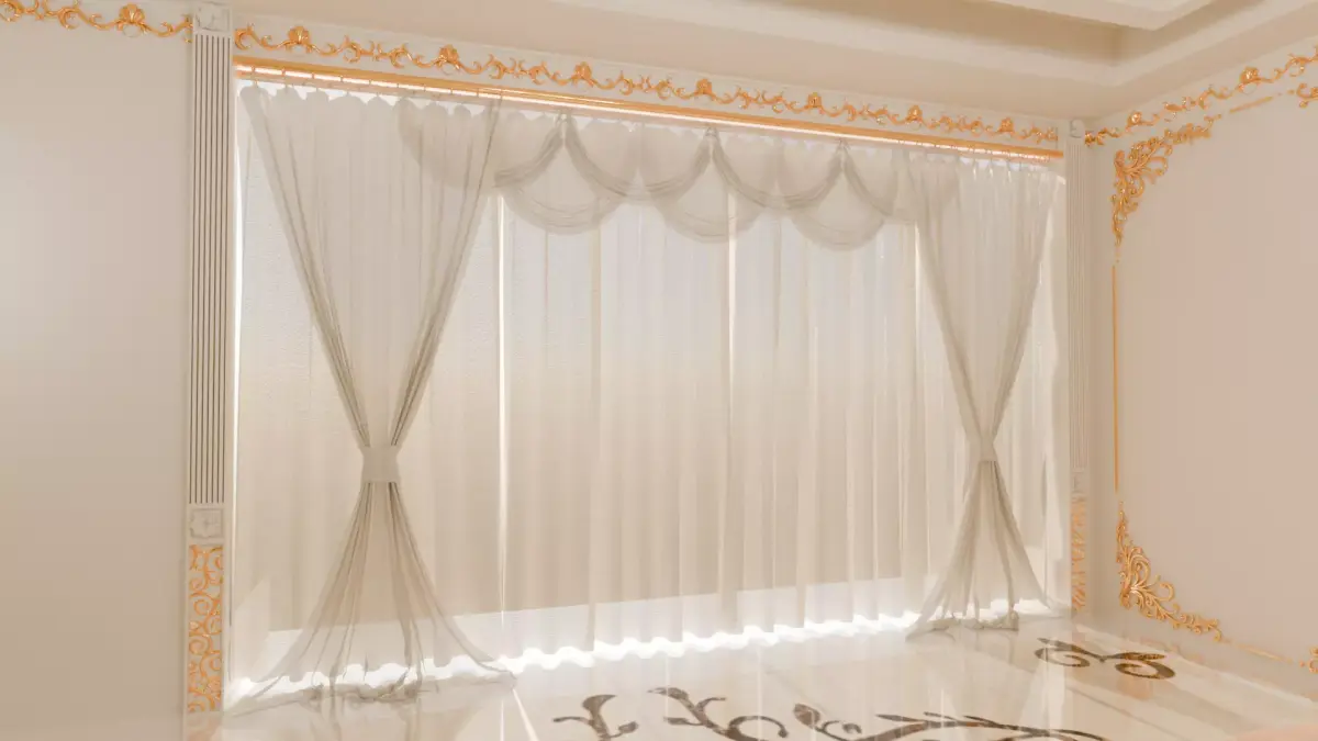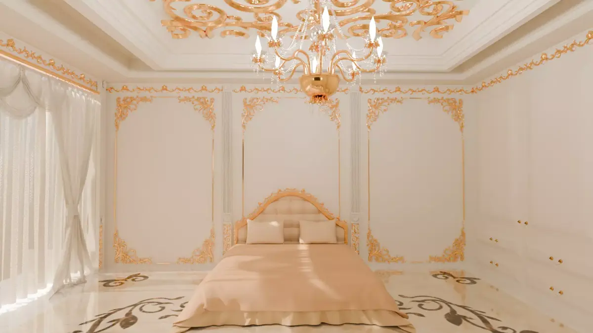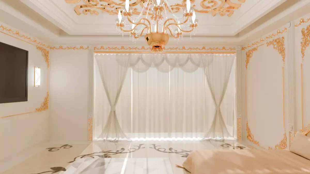 Bring elegance and sophistication to your projects with this luxurious 3D bedroom model, designed with stunning attention to detail. Featuring a beautifully decorated ceiling with golden ornamental patterns, a sparkling chandelier, and refined wall moldings, this interior exudes a royal and classic atmosphere. The soft, neutral-toned bed and flowing sheer curtains add warmth and comfort, balancing the grandeur with coziness.