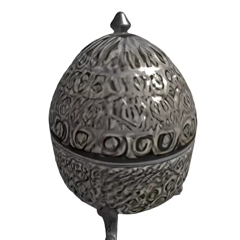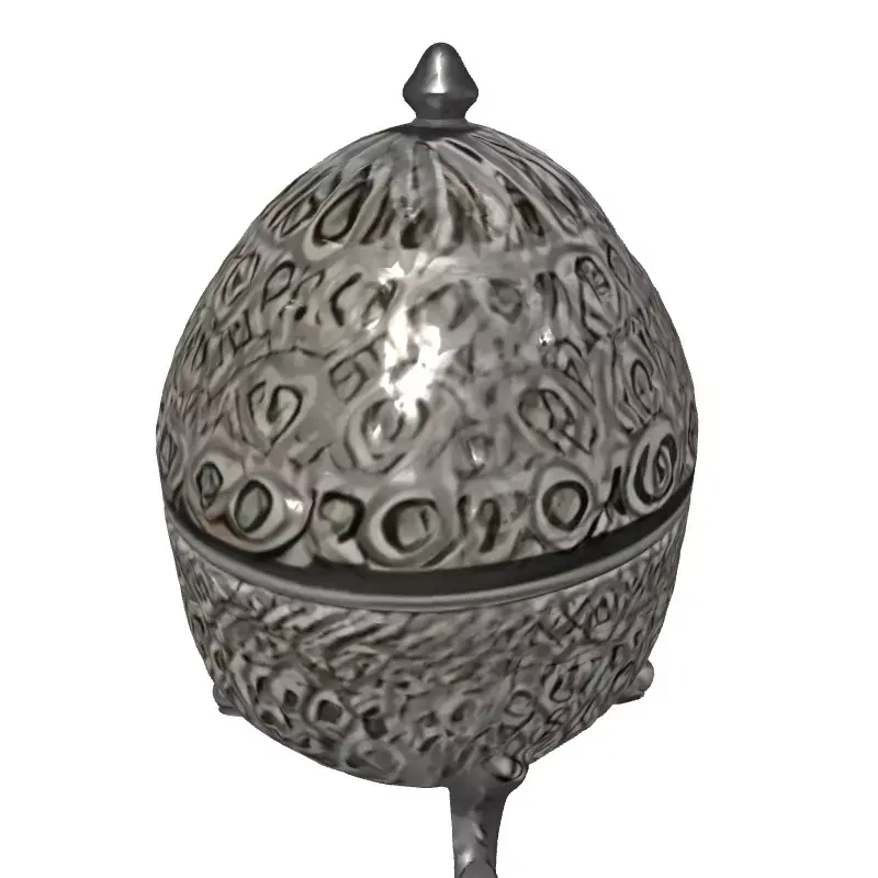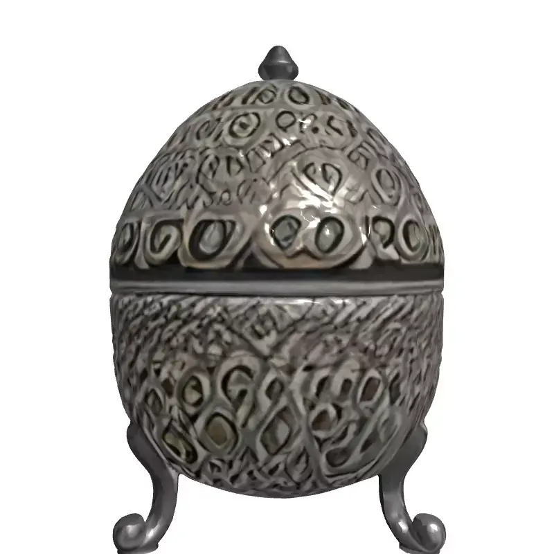This exquisite 3D model presents an elegantly crafted silver filigree egg-shaped box, designed with intricate decorative patterns. The model captures the delicate artistry of traditional metalwork, making it a perfect accent piece for various digital environments. It features a meticulously detailed filigree design across both its lid and base, resting gracefully on three ornate legs. This versatile asset is ideal for high-fidelity architectural visualization projects, bringing a touch of luxury and antique charm to interior scenes like living rooms, bedrooms, or offices. Digital artists will find it invaluable for creating sophisticated still renders, promotional product imagery, or enriching virtual museum and gallery exhibits. Furthermore, it is suitable for integration into film, animation, or high-end virtual reality (VR) experiences where visual fidelity is paramount. The model boasts clean geometry and is expected to be fully UV unwrapped with high-resolution PBR (Physically Based Rendering) textures, ensuring a realistic metallic silver finish under diverse lighting conditions. While highly detailed, it is optimized for close-up renders and static placements, offering exceptional visual quality. Supported file formats include GLB, OBJ, STL, ABC, DAE, FBX, USD, and PLY, ensuring broad compatibility across major 3D software and game engines. Its robust construction and detailed ornamentation make it a captivating decorative element or a sophisticated container for virtual valuables.