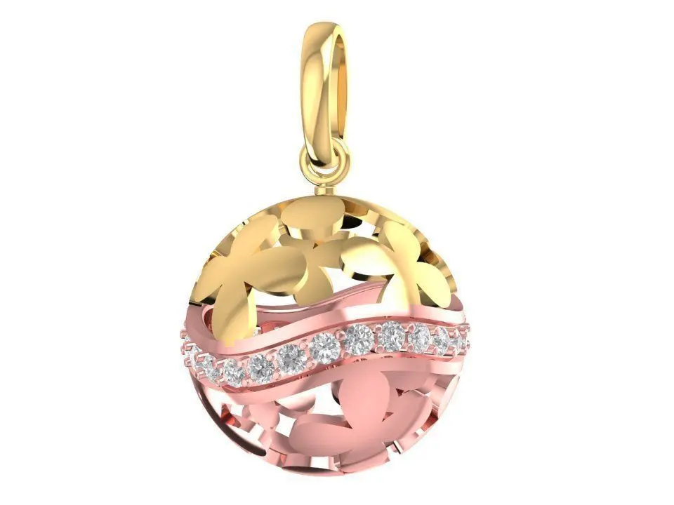 This 3D CAD model features an elegant sphere pendant with a unique openwork design. The pendant is divided into two sections: the upper part in yellow gold with decorative cutouts and the lower part in rose gold, joined by a wavy line set with sparkling accent stones. The star and leaf motifs create a playful yet luxurious look, making it suitable for both daily wear and special occasions.