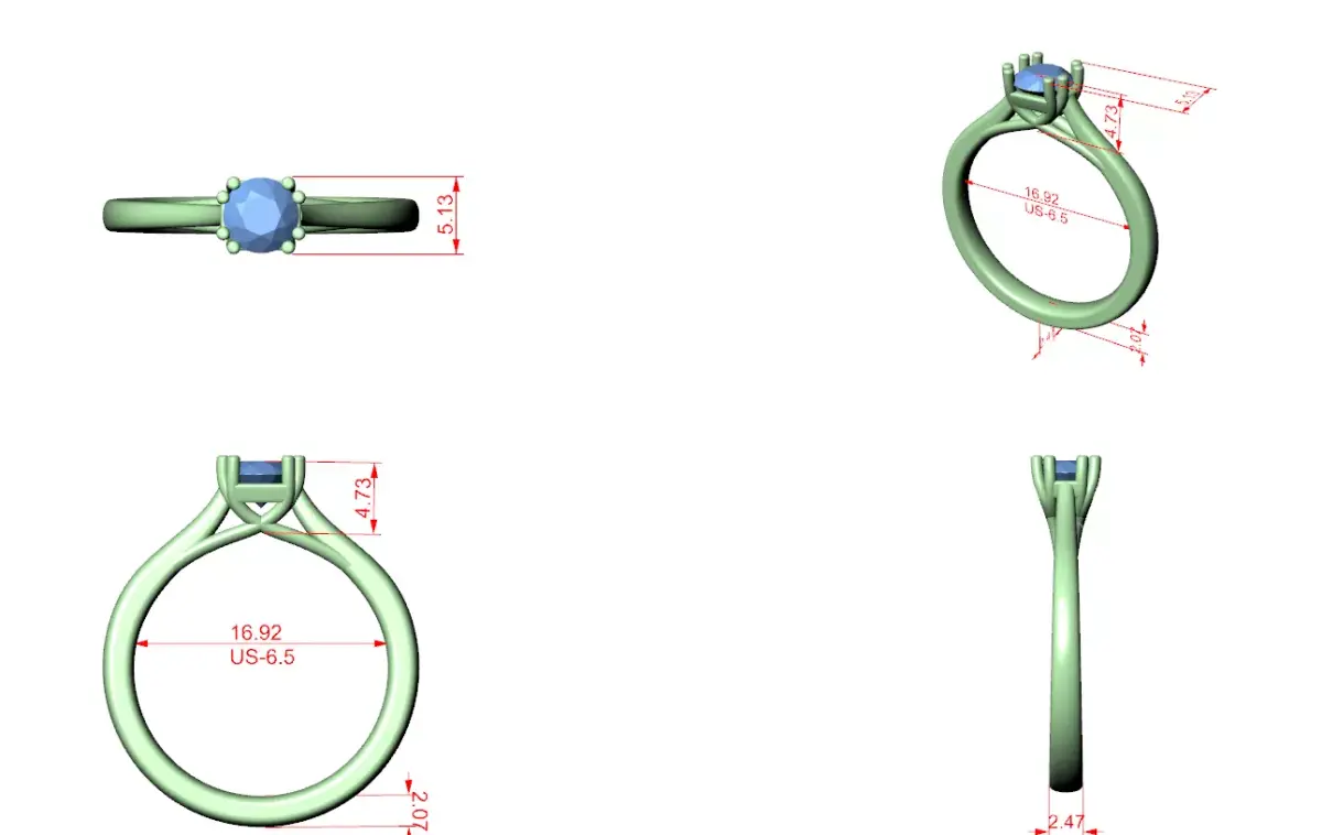 Important Points• Manufacturing-ready CAD construction• Elegant split shank band design• Secure center stone setting• Easy resizing and stone dimension modification possible• Suitable for casting and rendering workflows• Clean geometry for smooth finishing and polishing