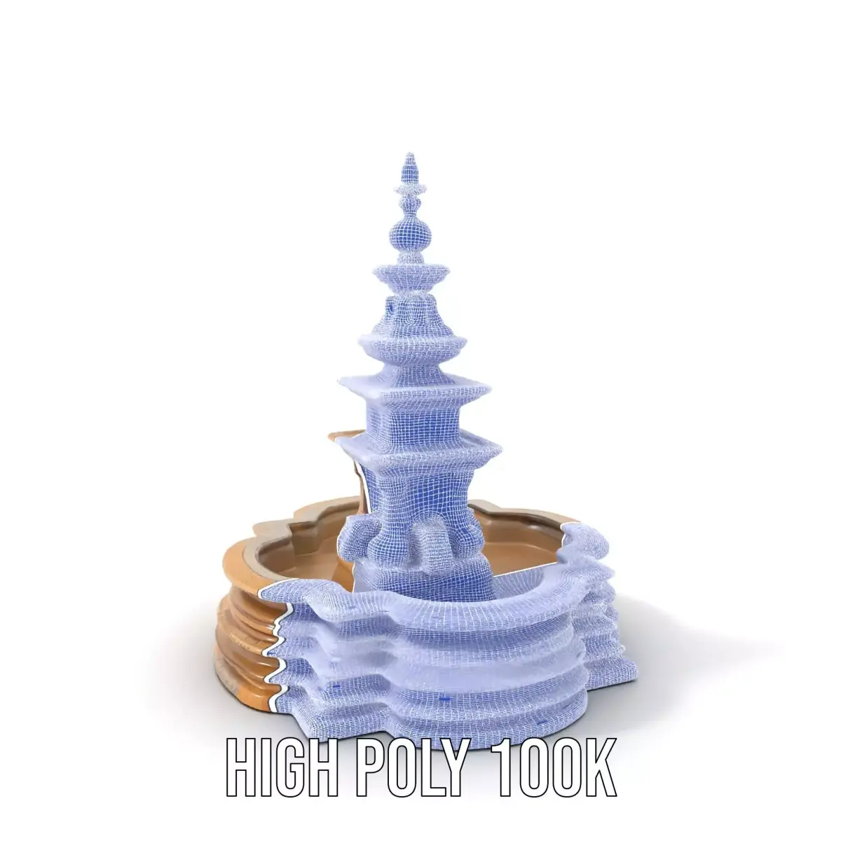 This elegant stone fountain model showcases intricate detailing and historic architectural style, making it ideal for use in garden designs, historical recreations, and urban environments. Each model has 3 levels of detail: low-poly (1000 triangles for mobile), middle-poly (10,000 triangles for environment), and high-poly (100,000 triangles), which allows for the use in production rendering (such as 3ds Max, Maya, Cinema4D, Blender, Vray/Corona/Cycles and all others), game engines (Unity and Unreal compatible), and interactive presentations, providing a choice of detail based on the LOD System principle. The fountain's textures are PBR, Diffuse, NormalMap, and reflection/roughness/metallic, which are suitable for any modern rendering engine. All models accurately unwrapped and have no overlapping UV. All textures are 4096*4096 in size. If you like the model, please leave a comment and a like.