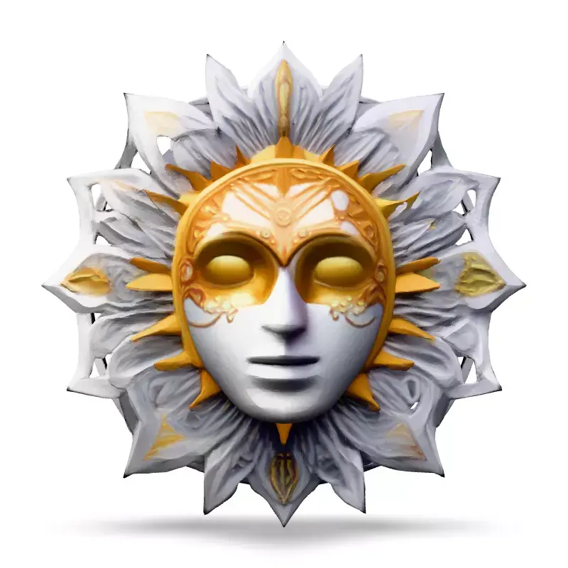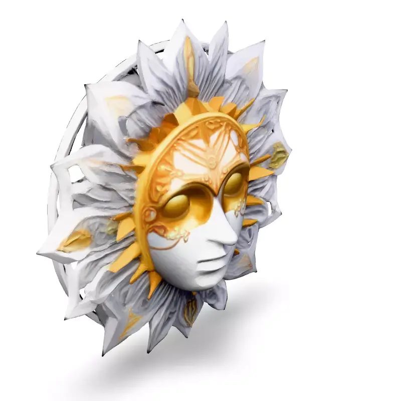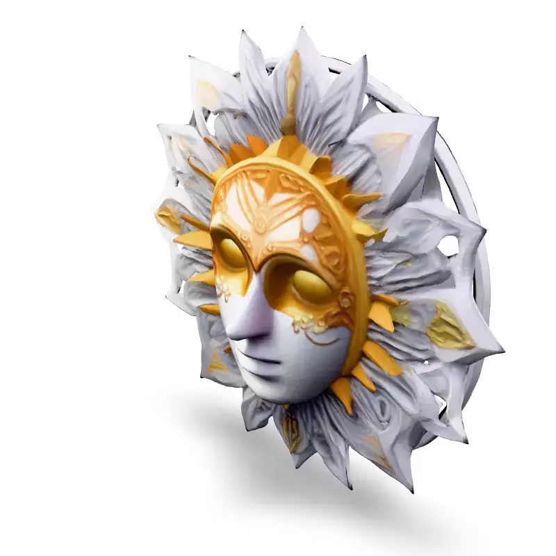This intricate 3D model features a Venetian-style mask adorned with a golden sunburst motif, ideal for adding a touch of elegance and mystique to your projects. Perfect for game development, architectural visualization, AR experiences, digital art, or even as a striking 3D printable piece. The model is available in multiple formats including GLB, OBJ, STL, FBX, and more. Optimized for both real-time and static rendering, this model boasts clean topology, UV unwrapped meshes, and high-resolution PBR textures for stunning visuals. Whether you're creating a fantastical game environment, a luxurious interior design, or a captivating piece of digital art, this sun mask will elevate your project with its detailed craftsmanship and artistic flair. It's ready for subdivision, allowing for high levels of detail if required. Its versatile design makes it suitable for various applications, from virtual environments to physical props.