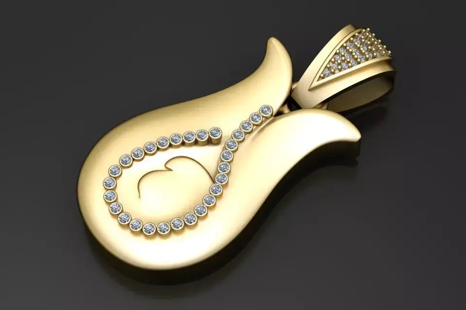 This beautifully crafted 3D printable gold pendant features a flowing teardrop-inspired silhouette with a smooth, luxurious surface. The outer curve is elegantly highlighted with precision-set round diamonds, creating a sparkling outline that enhances the natural shape of the pendant. The bail is designed with a stylish pavé diamond pattern, adding extra brilliance and sophistication.