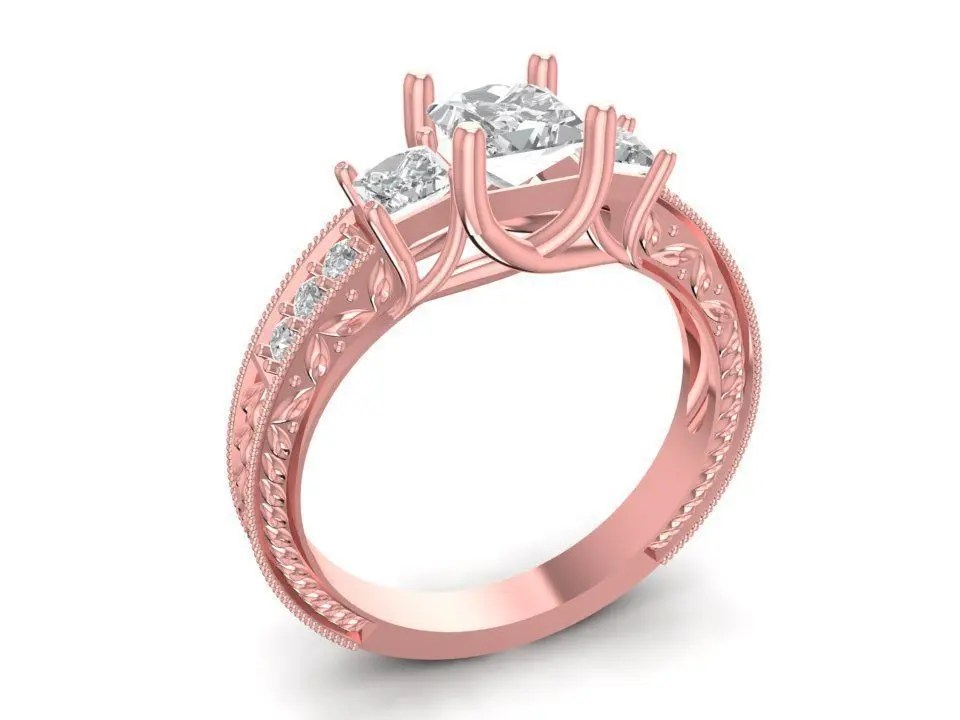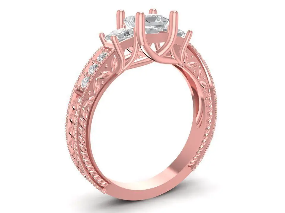 The CAD file is highly detailed and includes accurate proportions, stone seatings, and dimensions optimized for manufacturing. The ring can be produced in yellow gold, white gold, rose gold, or platinum. The center and side stones can be customized with diamond, moissanite, cubic zirconia, sapphire, or other gemstones.
