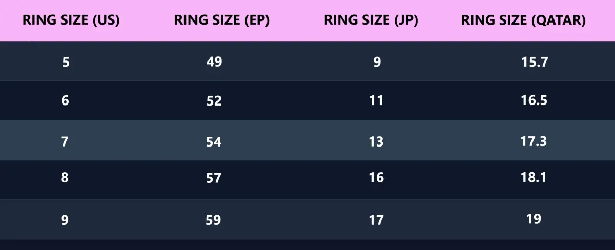 1.Available sizes: US 5, 6, 7, 8, 9 (equivalent to 49, 52, 54, 57, 59 in Europe and 9, 11, 16, 17 in Japan).