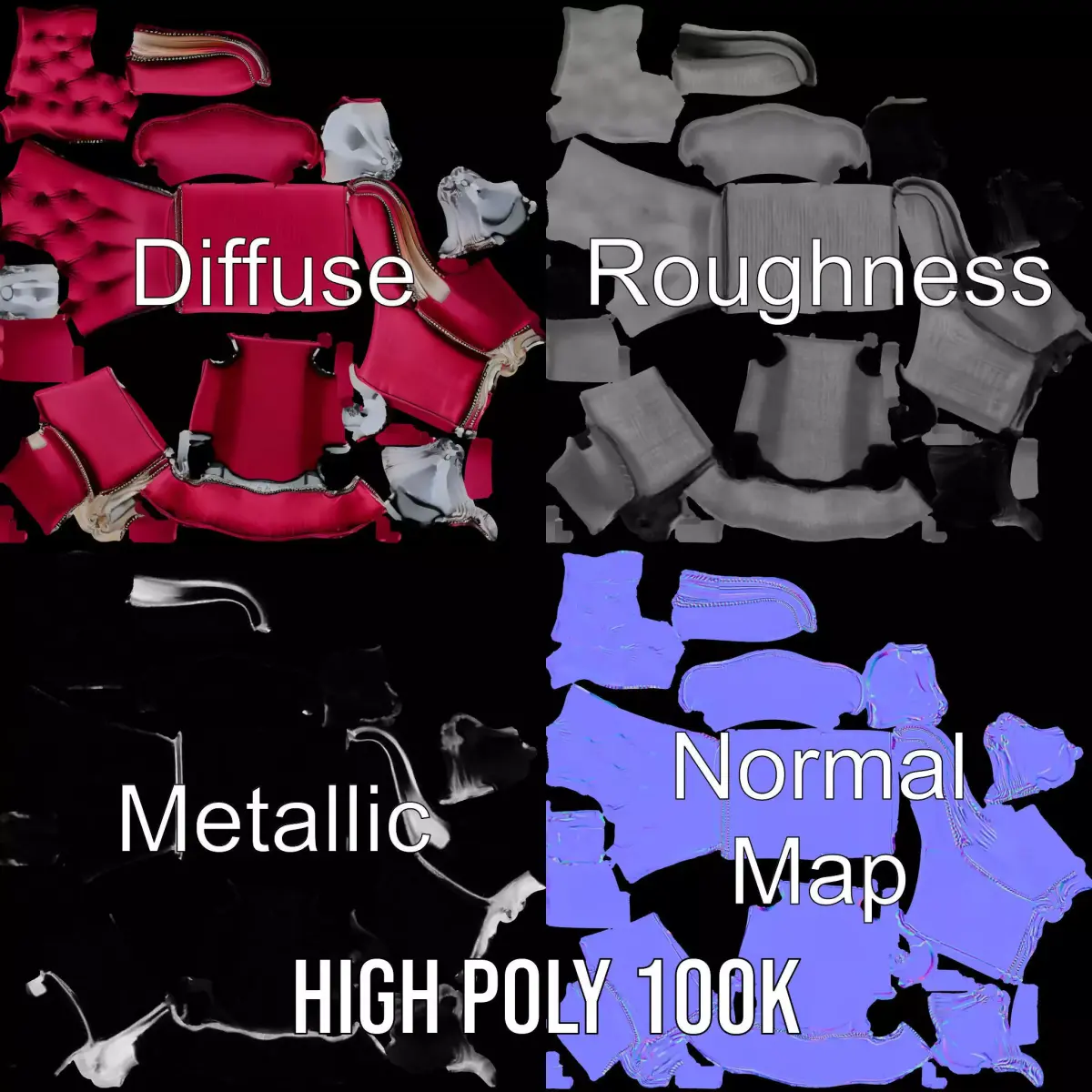The model's textures are PBR, Diffuse, NormalMap, and reflection/roughness/metallic, suitable for any modern rendering engine. All models are accurately unwrapped with no overlapping UVs.
