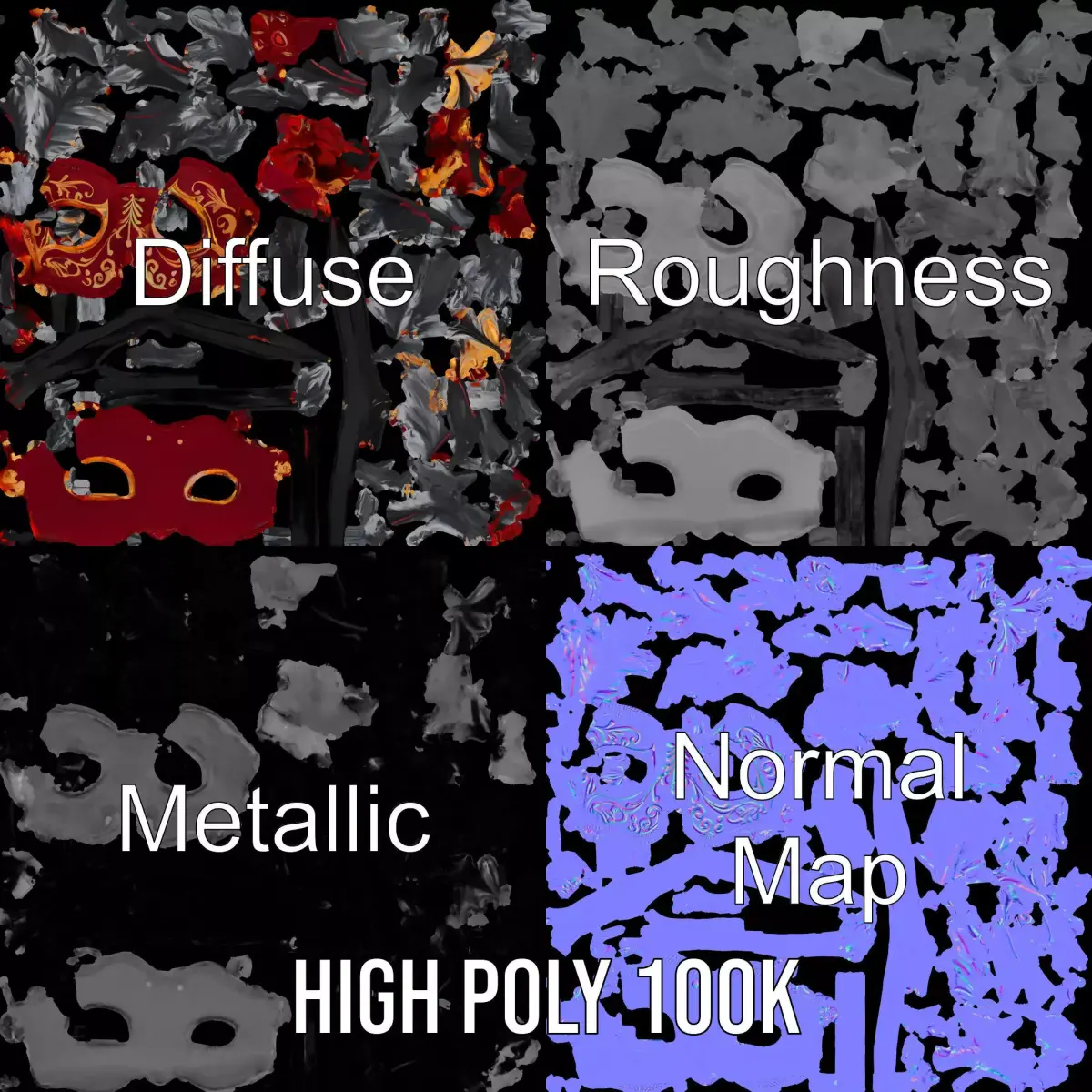 This elegant Venetian mask model is perfect for adding a touch of mystery and glamour to any scene. With intricate details and a rich color palette, it is ideal for use in historical settings, theatrical productions, or themed events. Each model has 3 levels of detail: low-poly (1000 triangles for mobile), middle-poly (10,000 triangles for environment), and high-poly (100,000 triangles), which allows for the use of this model in production rendering (such as 3ds Max, Maya, Cinema4D, Blender, Vray/Corona/Cycles and all other), game engines (Unity and Unreal compatible), and interactive presentations, providing a choice of detail based on the LOD System principle. The model's textures are PBR, Diffuse, NormalMap, and reflection/roughness/metallic, which are suitable for any modern rendering engine. All models are accurately unwrapped and have no overlapping UV. All textures are 4096*4096 in size. If you like this model, please leave a comment and like it.