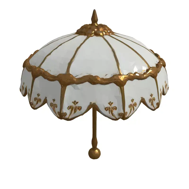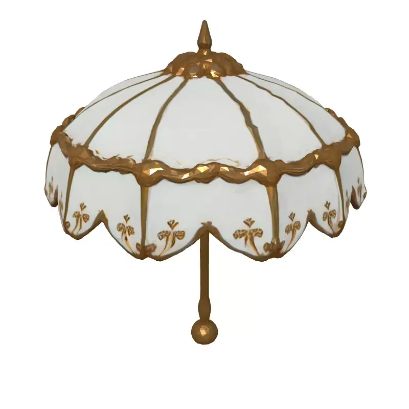 This 3D model depicts an elegant Victorian-era parasol, featuring a white canopy with intricate golden embellishments and a detailed golden pole and handle. Ideal for various applications, including game development, architectural visualization, historical recreations, and digital art projects. This model is available in multiple formats, including GLB, OBJ, FBX, and STL, ensuring compatibility with various software. Optimized for both real-time and static rendering, the parasol boasts clean topology and is UV unwrapped for easy texturing. Whether you're crafting a period-piece game, designing a luxurious virtual environment, or creating a stunning still render, this parasol adds a touch of vintage charm. The model's high-quality details and textures make it suitable for close-up shots and high-resolution renders. This model can be 3D printed, allowing for physical realization of this beautiful piece. Its exquisite design makes it a versatile asset for any project requiring a touch of historical elegance.