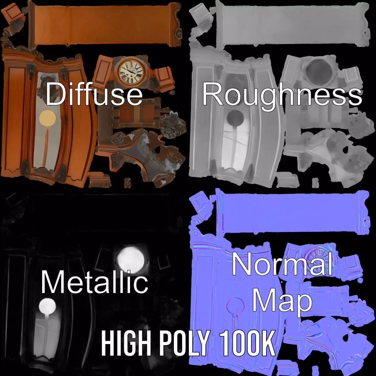 This Elegant Walnut Grandfather Clock model pack offers a beautifully detailed and timeless design, perfect for adding a touch of sophistication to any scene or environment. Each model has 3 levels of detail: low-poly (1000 triangles for mobile), middle-poly (10,000 triangles for environment), and high-poly (100,000 triangles), which allows for use in production rendering (such as 3ds Max, Maya, Cinema4d, Blender, Vray/Corona/Cycles and all others), game engines (Unity and Unreal compatible), and interactive presentations, providing a choice of detail based on the LOD System principle. Ideal for antique stores, historical interiors, or luxury settings. Features PBR, Diffuse, NormalMap, and reflection/roughness/metallic textures, suitable for any modern rendering engine. All textures are 4096*4096 in size. Models are accurately unwrapped with no overlapping UV. If you enjoy this model pack, please like and leave a comment.