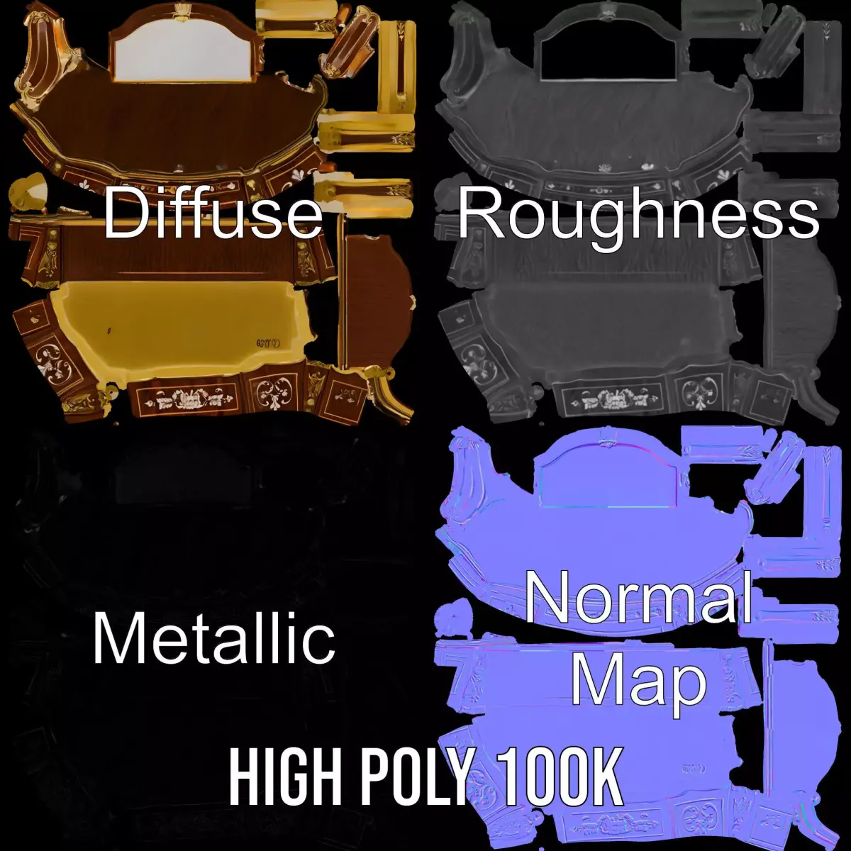 Ideal for use in historical film settings, luxury home decor simulations, or architectural visualization projects, this model offers versatility and style. The model's textures are PBR, Diffuse, NormalMap, and reflection/roughness/metallic, which are suitable for any modern rendering engine. All models accurately unwrapped and have no overlapping UV. All textures are 4096*4096 in size.