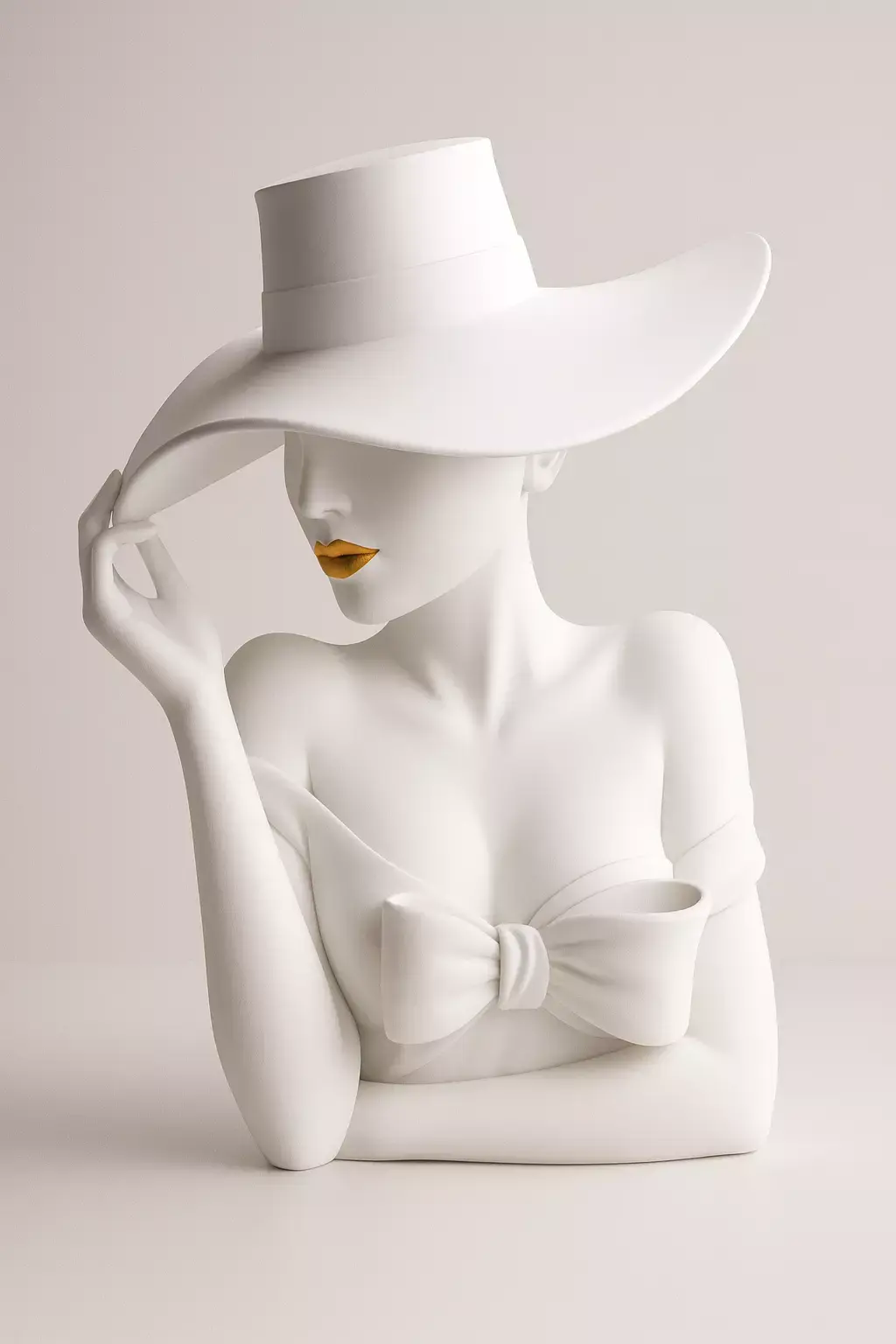 This is a unique decorative sculpture of an elegant woman wearing a wide-brimmed hat, designed to also function as a planter or flower pot. The top of the hat is hollow, allowing you to place plants, flowers, or decorative arrangements inside.