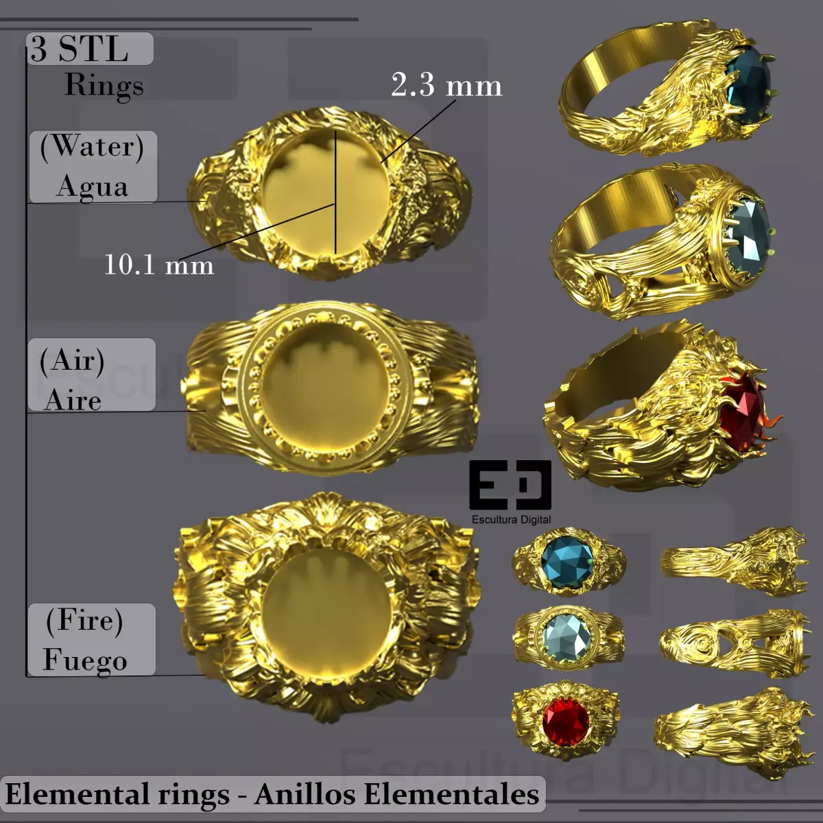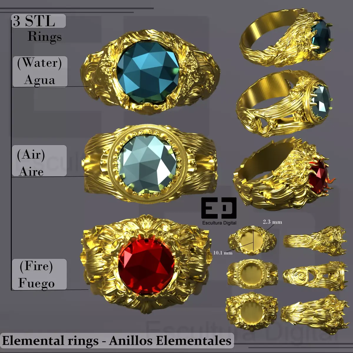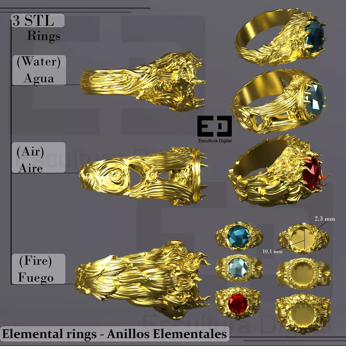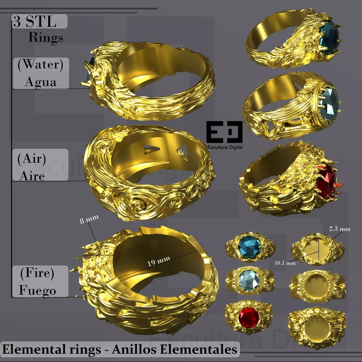 Internal ring diameter: 19 mm.Gem seat diameter: 10.1 mm.Gem seat depth: 2.3 mm.Includes three distinct ring styles based on elemental themes: Water, Air, and Fire.Designed for 3D printing and casting workflows.