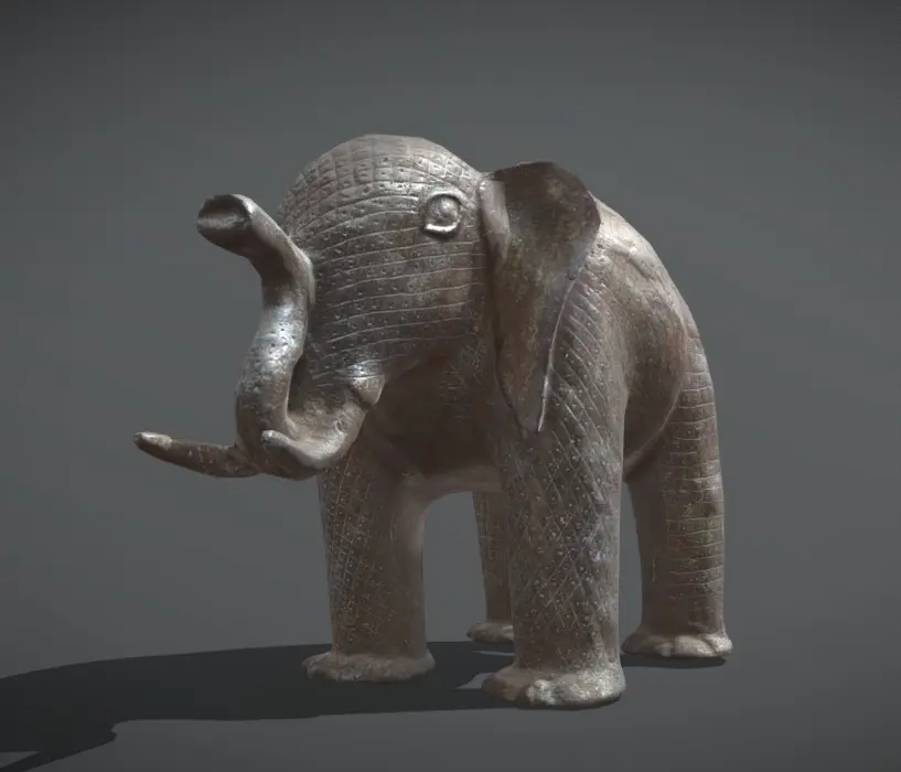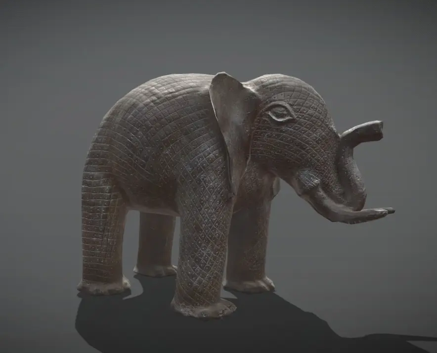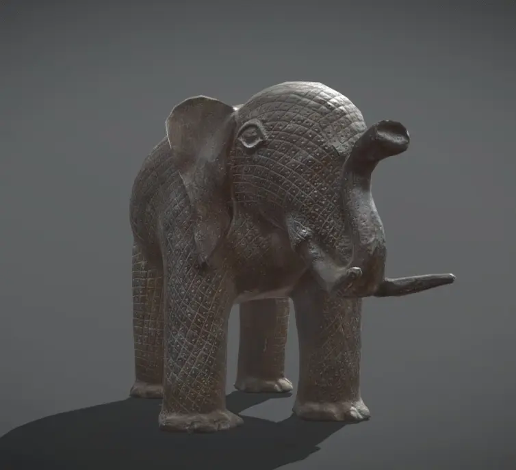 Benin Bronze sculpture of an elephant. The piece showcases the intricate craftsmanship characteristic of Benin art, with detailed texturing across the elephant's body. The surface of the sculpture is covered with a crosshatch pattern, creating a sense of texture and depth. The elephant's trunk is raised, a common feature in artistic depictions to symbolize strength and power. The ears are large and lifelike, adding to the realism of the sculpture. The overall form is robust and well-proportioned, demonstrating the skill of the Benin artisans in working with bronze to create detailed and expressive figures.