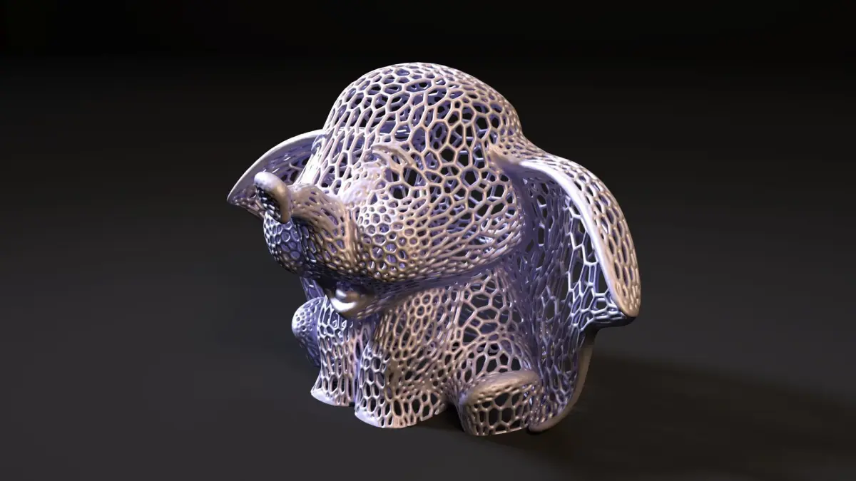 The model is a stylised elephant Dumbo,made in Voronoi's original and modern approach. The elephant's shaperetains recognisable features such as large ears and a friendly expression.face, but is framed by a mesh structure that creates an interesting visualeffect.